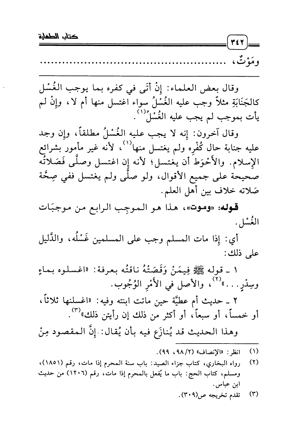 1 - قوله صلّى الله عليه وسلّم فِيمَنْ وَقَصَتْهُ ناقتُه بعرفة: «اغسلوه بماءٍ وسِدْرٍ ... » (¬2)، والأصل في الأَمْرِ الوُجُوب.