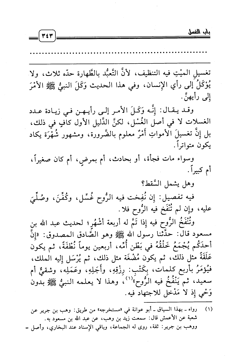 وتُنْفَخُ الرُّوح فيه إِذا تَمَّ له أربعة أشْهُرٍ؛ لحديث عبد الله بن مسعود قال: حدَّثنا رسول الله صلّى الله عليه وسلّم وهو الصَّادق المصدوق: «إِنَّ أحدَكُم يُجْمَعُ خَلْقُهُ في بَطْن أُمِّه، أربعين يوماً نُطْفَةً، ثم يكون عَلَقَةً مثل ذلك، ثم يكون مُضْغَة مثل ذلك، ثم يُرْسَل إِليه الملك، فيُؤمَرُ بأربع كلمات، بِكَتْبِ: رِزْقِهِ، وأَجَلِهِ، وعَمَلِه، وشقيٌّ أم سعيد، ثم يَنْفُخُ فيه الرُّوح» (¬1)، وهذا لا يعلمه النبيُّ صلّى الله عليه وسلّم بدون وَحْي إِذ لا مَدْخل للاجتهاد فيه.