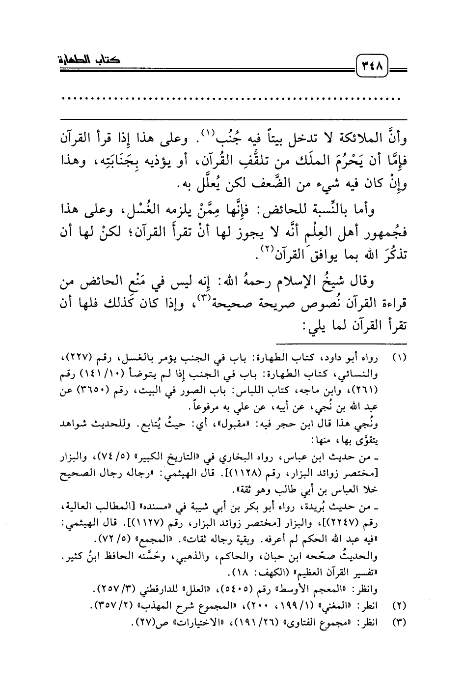 وقال شيخُ الإسلام رحمه الله: إِنه ليس في مَنْعِ الحائض من قراءة القرآن نُصوص صريحة صحيحة (¬3)، وإذا كان كذلك فلها أن تقرأ القرآن لما يلي: