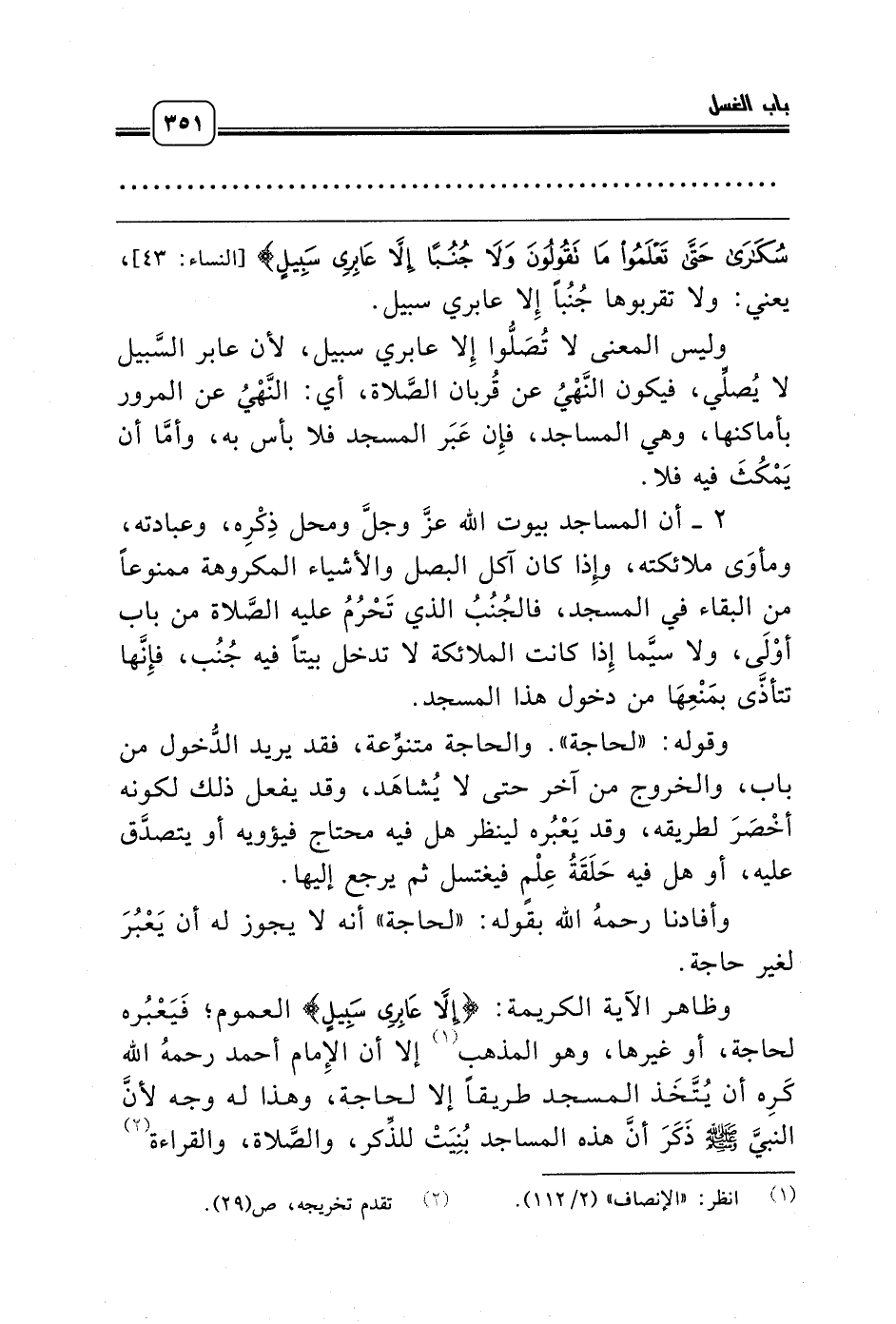 وليس المعنى لا تُصَلُّوا إِلا عابري سبيل، لأن عابر السَّبيل لا يُصلِّي، فيكون النَّهْيُ عن قُربان الصَّلاة، أي: النَّهْيُ عن المرور بأماكنها، وهي المساجد، فإِن عَبَر المسجد فلا بأس به، وأمَّا أن يَمْكُثَ فيه فلا.