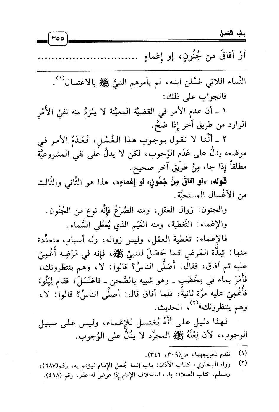 فالإِغماء: تغطية العقل، وليس زواله، وله أسباب متعدِّدة منها: شِدَّة المَرضِ كما حَصَلَ للنبيِّ صلّى الله عليه وسلّم، فإِنه في مَرَضِه أُغْمِيَ عليه ثم أفاق، فقال: أَصَلَّى الناسُ؟ قالوا: لا، وهم ينتظرونك، فأَمَرَ بماء في مِخْضَبٍ ـ وهو شبيه بالصَّحن ـ فاغتَسَلَ؛ فقام لِيَنُوءَ فأُغْمِيَ عليه مرَّة ثانية، فلما أفاق قال: أصلَّى الناسُ؟ قالوا: لا، وهم ينتظرونك» (¬2)، الحديث.