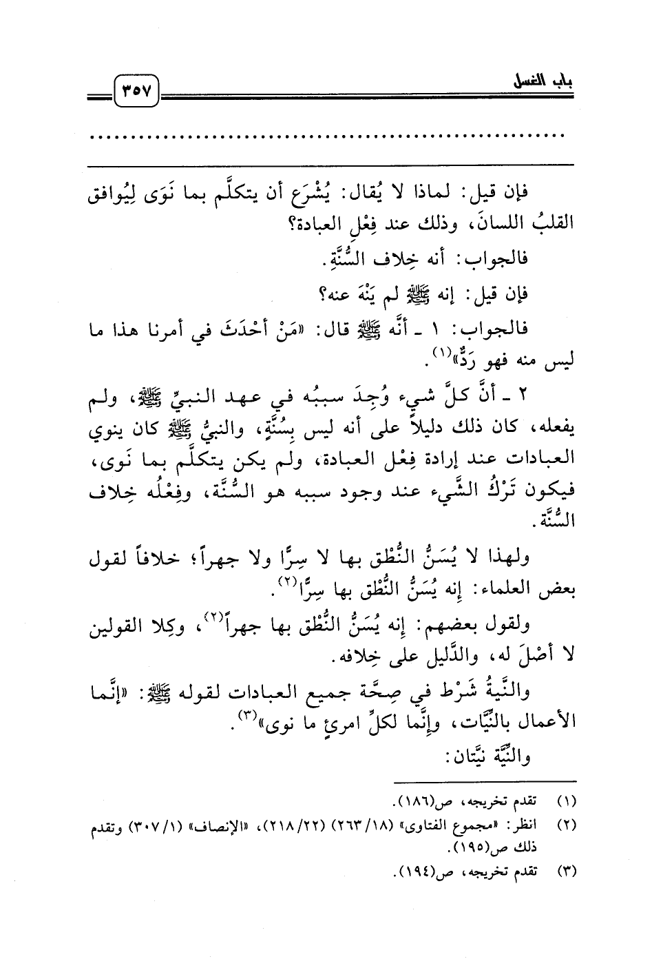 ولهذا لا يُسَنُّ النُّطْق بها لا سِرًّا ولا جهراً؛ خلافاً لقول بعض العلماء: إِنه يُسَنُّ النُّطْق بها سِرًّا (¬2).
