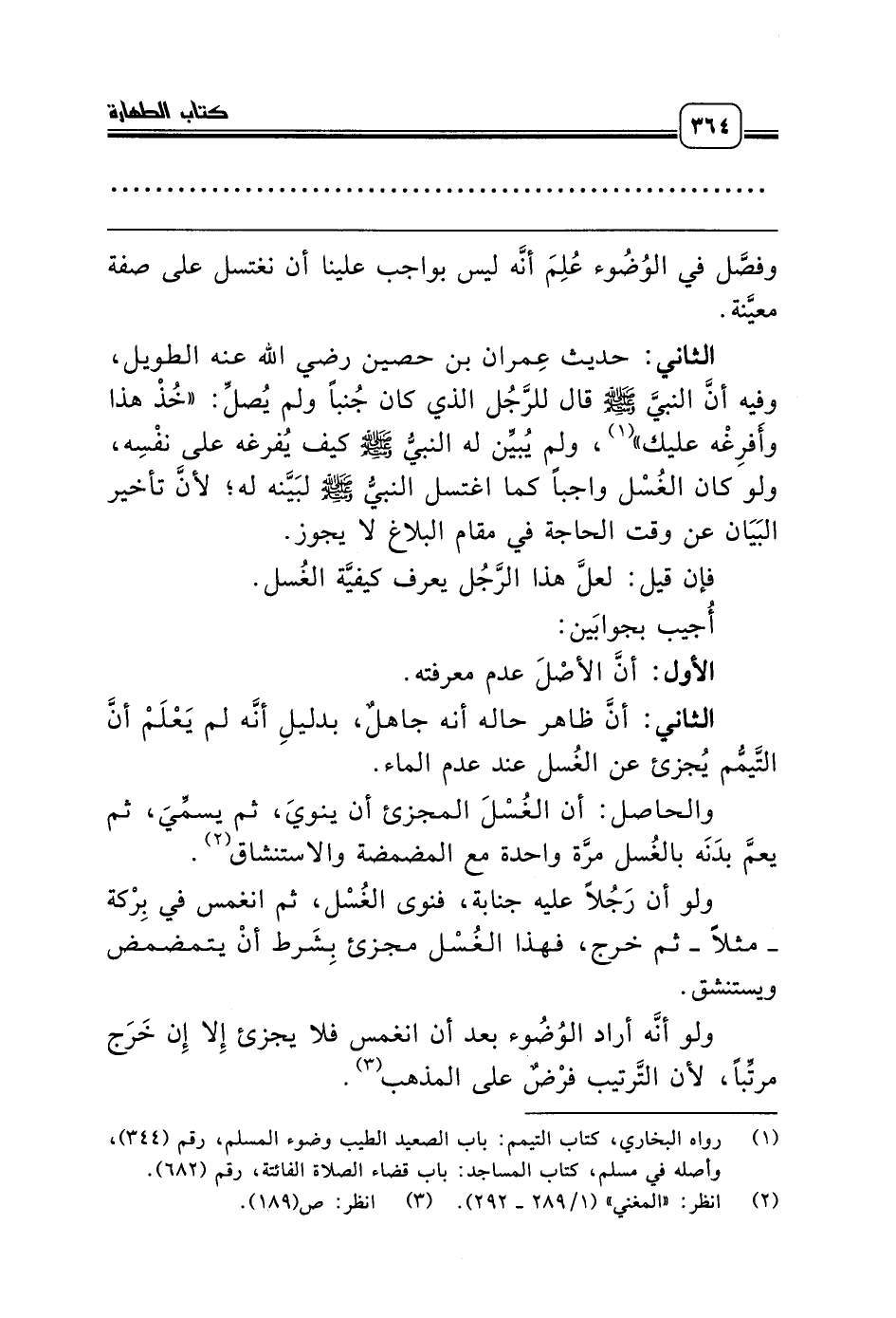 الثاني: حديث عِمران بن حصين رضي الله عنه الطويل، وفيه أنَّ النبيَّ صلّى الله عليه وسلّم قال للرَّجُل الذي كان جُنباً ولم يُصلِّ: «خُذْ هذا وأَفرِغْه عليك» (¬1)، ولم يُبيِّن له النبيُّ صلّى الله عليه وسلّم كيف يُفرغه على نفْسِه، ولو كان الغُسْل واجباً كما اغتسل النبيُّ صلّى الله عليه وسلّم لبَيَّنه له؛ لأنَّ تأخير البَيَان عن وقت الحاجة في مقام البلاغ لا يجوز.