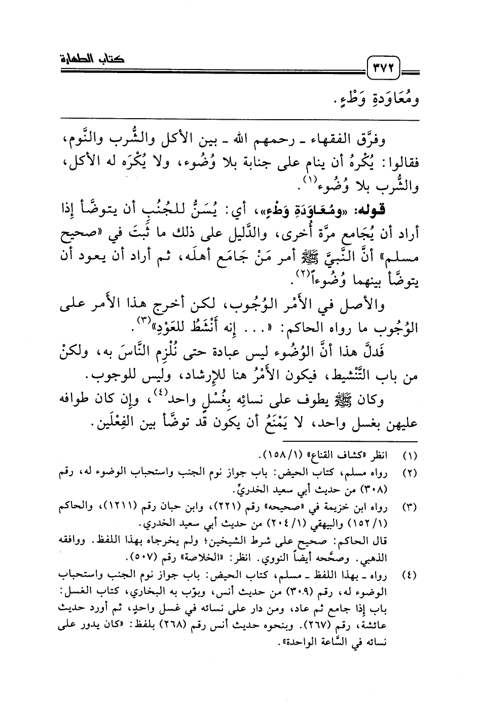 قوله: «ومُعَاوَدَةِ وَطْءٍ»، أي: يُسَنُّ للجُنُبِ أن يتوضَّأ إِذا أراد أن يُجَامع مرَّة أُخرى، والدَّليل على ذلك ما ثَبتَ في «صحيح مسلم» أنَّ النَّبيَّ صلّى الله عليه وسلّم أمر مَنْ جَامَع أهلَه، ثم أراد أن يعود أن يتوضَّأ بينهما وُضُوءاً (¬2).