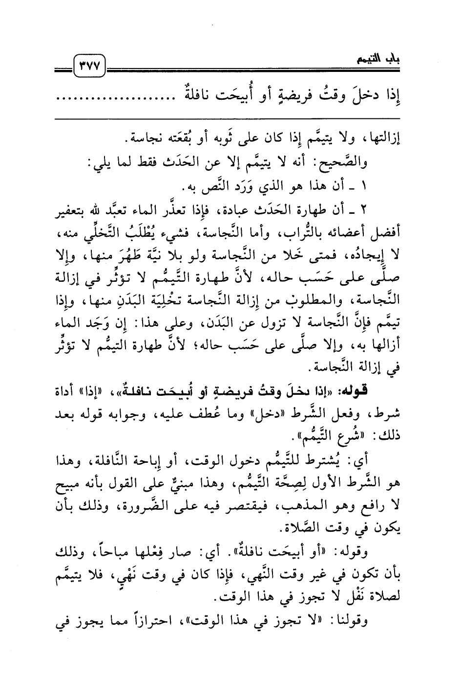 قوله: «إذا دخلَ وقتُ فريضةٍ أو أُبيحَت نافلةٌ»، «إذا» أداة شرط، وفعل الشَّرط «دخل» وما عُطف عليه، وجوابه قوله بعد ذلك: «شُرع التَّيمُّم».