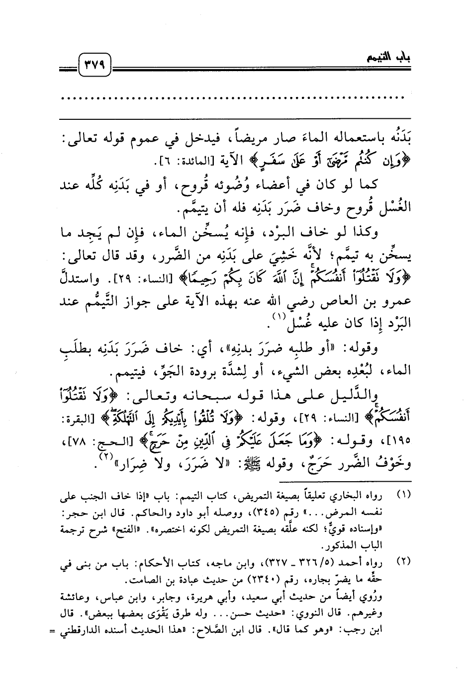 (¬1) رواه البخاري تعليقاً بصيغة التمريض، كتاب التيمم: باب «إذا خاف الجنب على نفسه المرض ... » رقم (345)، ووصله أبو داود والحاكم. قال ابن حجر: «وإسناده قويٌّ؛ لكنه علَّقه بصيغة التمريض لكونه اختصره». «الفتح» شرح ترجمة الباب المذكور.