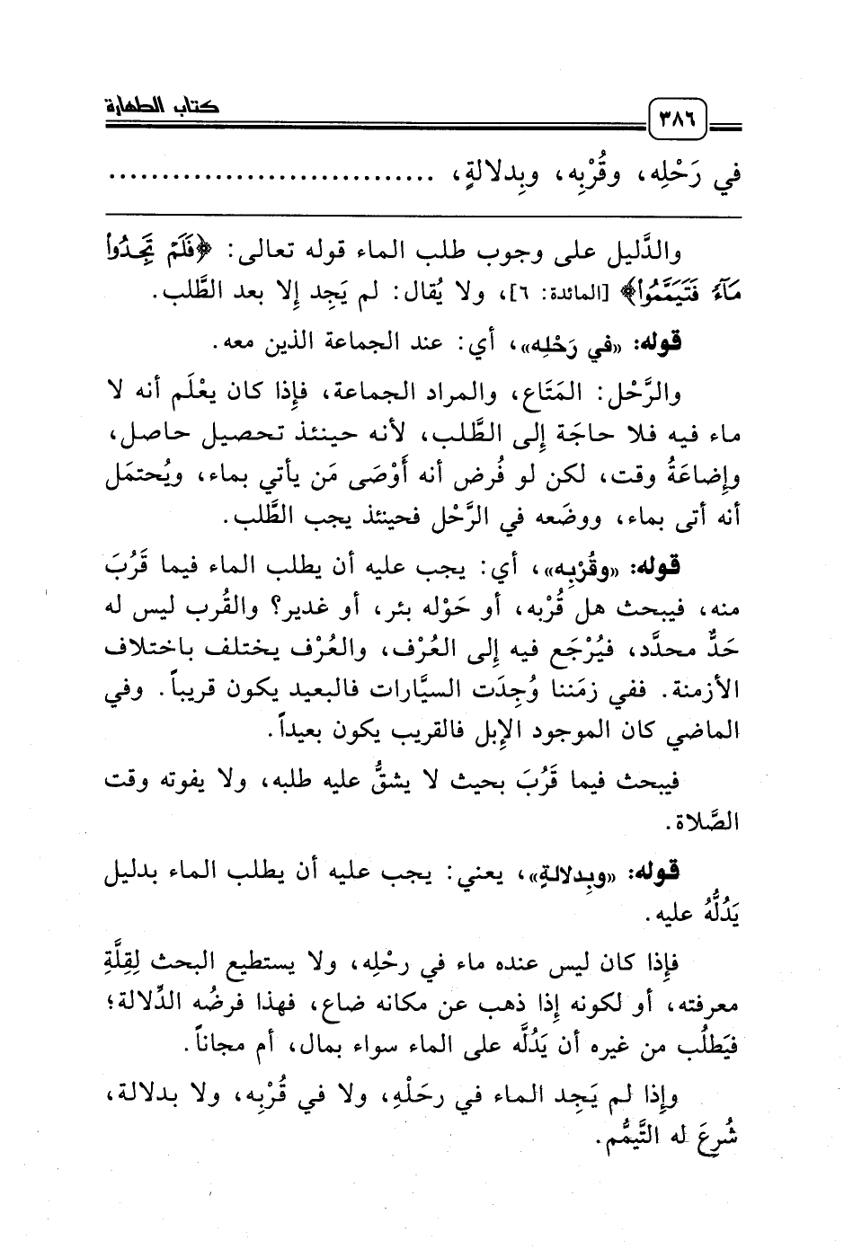قوله: «وقُرْبِه»، أي: يجب عليه أن يطلب الماء فيما قَرُبَ منه، فيبحث هل قُرْبه، أو حَوْله بئر، أو غدير؟ والقُرب ليس له حَدٌّ محدَّد، فيُرْجَع فيه إِلى العُرْف، والعُرْف يختلف باختلاف الأزمنة. ففي زمَننا وُجِدَت السيَّارات فالبعيد يكون قريباً. وفي الماضي كان الموجود الإِبل فالقريب يكون بعيداً.