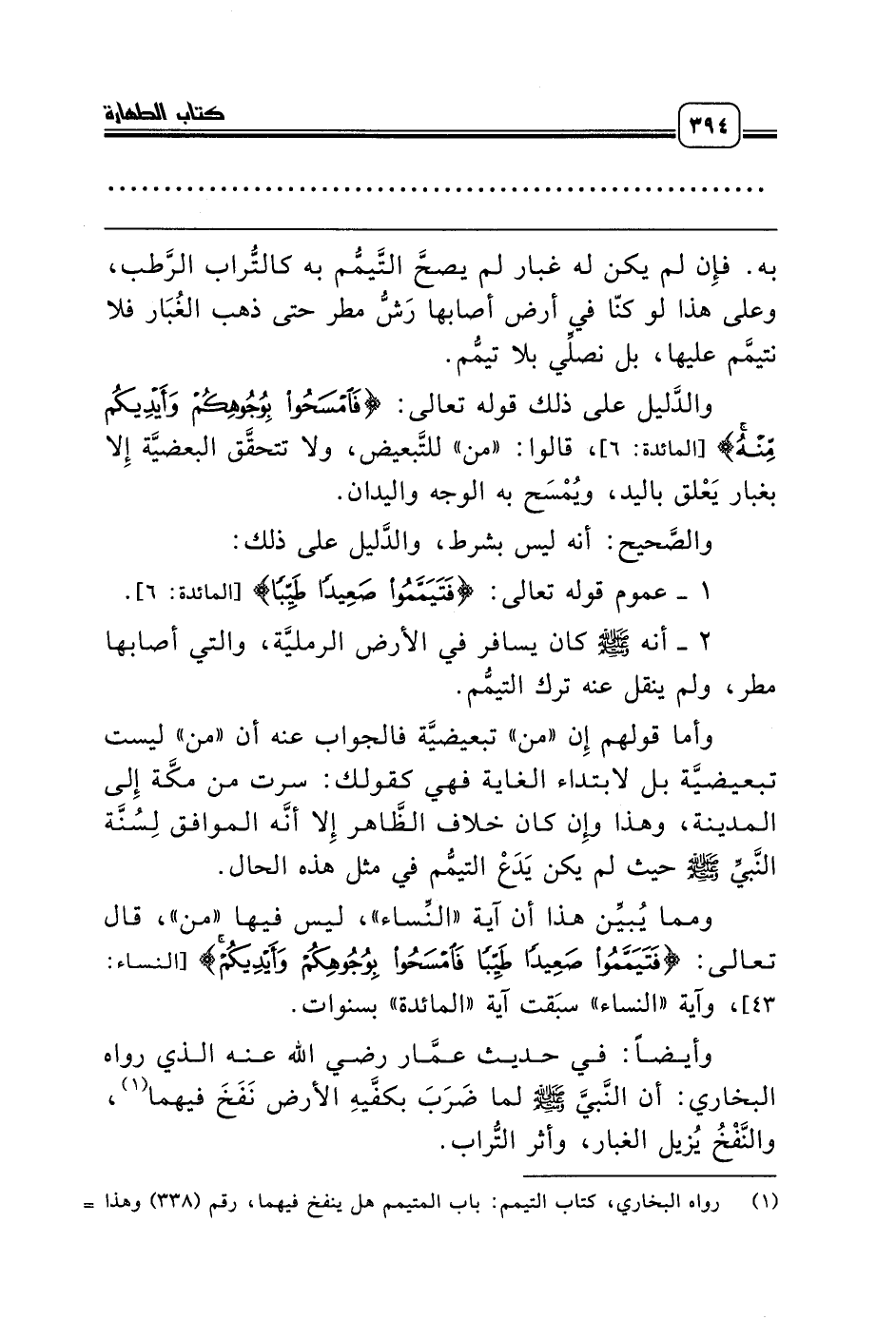 (¬1) رواه البخاري، كتاب التيمم: باب المتيمم هل ينفخ فيهما، رقم (338) وهذا لفظه، وفي باب التيمم ضربة، رقم (347) وفيه: أنه نَفَضَ كفَّيه، ومسلم، كتاب الحيض: باب التيمم، رقم (368) ولفظه: «إنما كان يكفيك أن تضرب بيديك الأرض، ثم تَنْفُخَ، ثم تمسحَ بهما وجهك وكفَّيك».