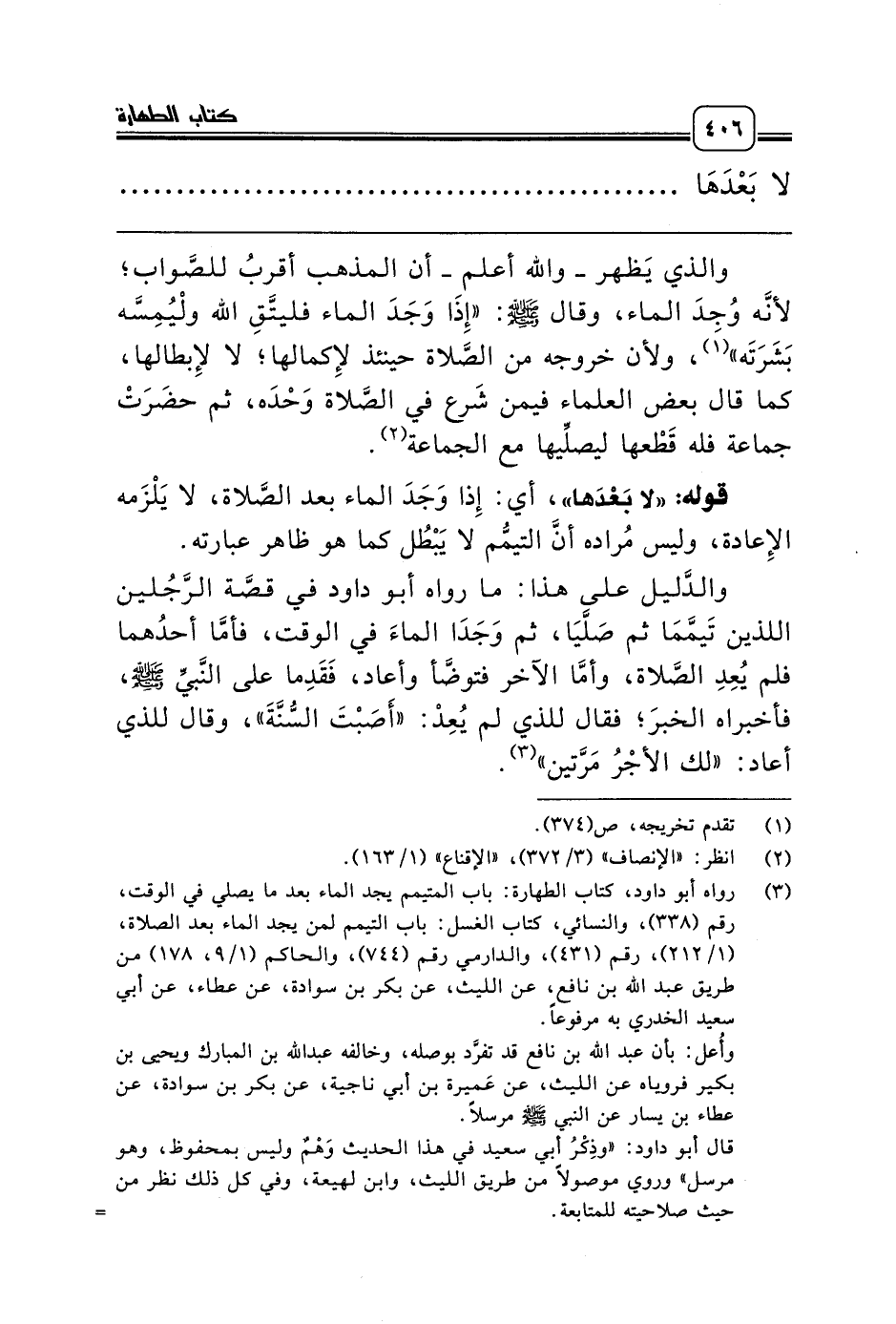 (¬3) رواه أبو داود، كتاب الطهارة: باب المتيمم يجد الماء بعد ما يصلي في الوقت، رقم (338)، والنسائي، كتاب الغسل: باب التيمم لمن يجد الماء بعد الصلاة، (1/ 212)، رقم (431)، والدارمي رقم (744)، والحاكم (1/ 9، 178) من طريق عبد الله بن نافع، عن الليث، عن بكر بن سوادة، عن عطاء، عن أبي سعيد الخدري به مرفوعاً.