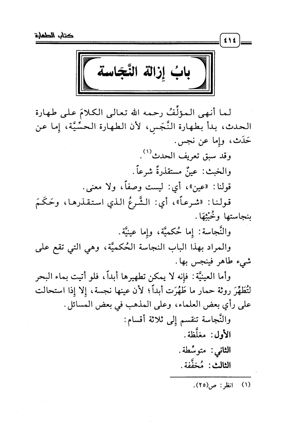 لما أنهى المؤلِّفُ رحمه الله تعالى الكلامَ على طهارة الحدث، بدأ بطهارة النَّجَسِ، لأن الطهارة الحسِّيَّة، إِما عن حَدَث، وإِما عن نجس.