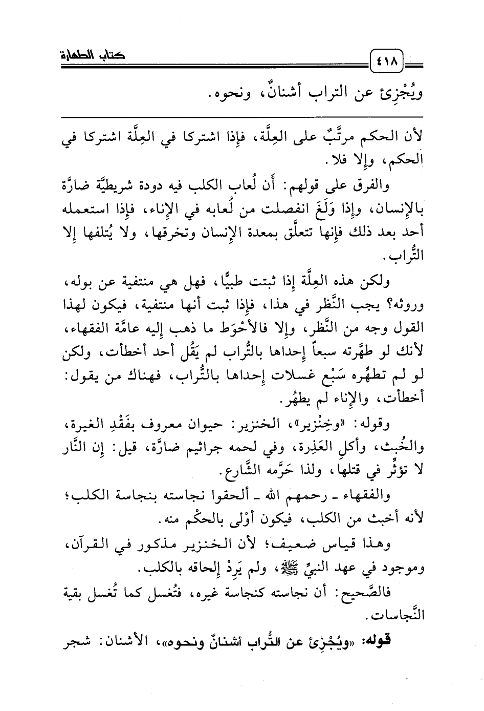 ولكن هذه العِلَّة إِذا ثبتت طبيًّا، فهل هي منتفية عن بوله، وروثه؟ يجب النَّظر في هذا، فإِذا ثبت أنها منتفية، فيكون لهذا القول وجه من النَّظر، وإِلا فالأحْوَط ما ذهب إِليه عامَّة الفقهاء، لأنك لو طهَّرته سبعاً إِحداها بالتُّراب لم يَقُل أحد أخطأت، ولكن لو لم تطهِّره سَبْع غسلات إِحداها بالتُّراب، فهناك من يقول: أخطأت، والإِناء لم يطهُر.