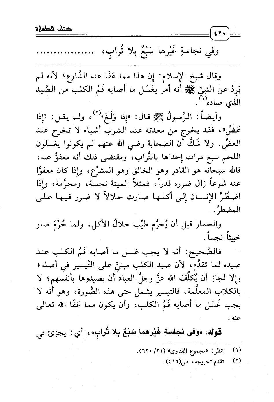 وقال شيخ الإِسلام: إِن هذا مما عَفَا عنه الشَّارع؛ لأنه لم يَرِدْ عن النبيِّ صلّى الله عليه وسلّم أنه أمر بغَسْل ما أصابه فَمُ الكلب من الصَّيد الذي صاده (¬1).