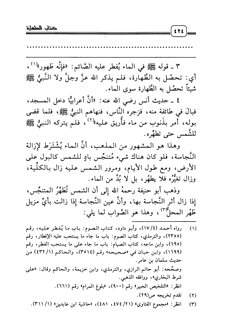 وذهب أبو حنيفة رحمه الله إِلى أن الشمس تُطَهِّرُ المتنجِّس، إِذا زال أثر النَّجاسة بها، وأنَّ عين النَّجاسة إِذا زالت بأيِّ مزيل طَهُر المحلُّ (¬3)، وهذا هو الصَّواب لما يلي: