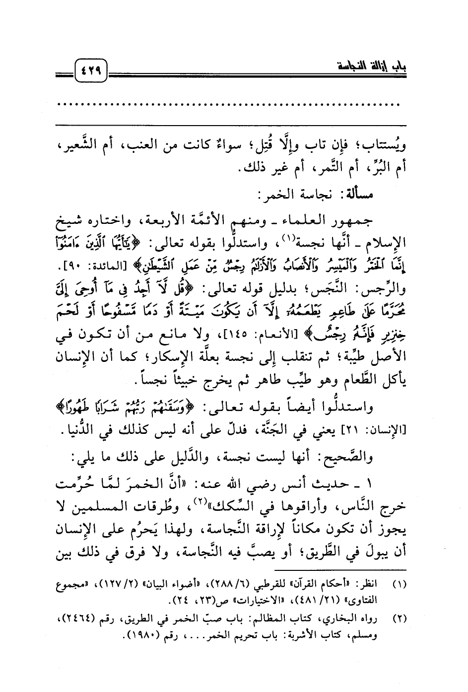 1 - حديث أنس رضي الله عنه: «أنَّ الخمرَ لمَّا حُرِّمت خرج النَّاس، وأراقوها في السِّكك» (¬2)، وطُرقات المسلمين لا يجوز أن تكون مكاناً لإِراقة النَّجاسة، ولهذا يَحرُم على الإِنسان أن يبولَ في الطَّريق؛ أو يصبَّ فيه النَّجاسة، ولا فرق في ذلك بين
