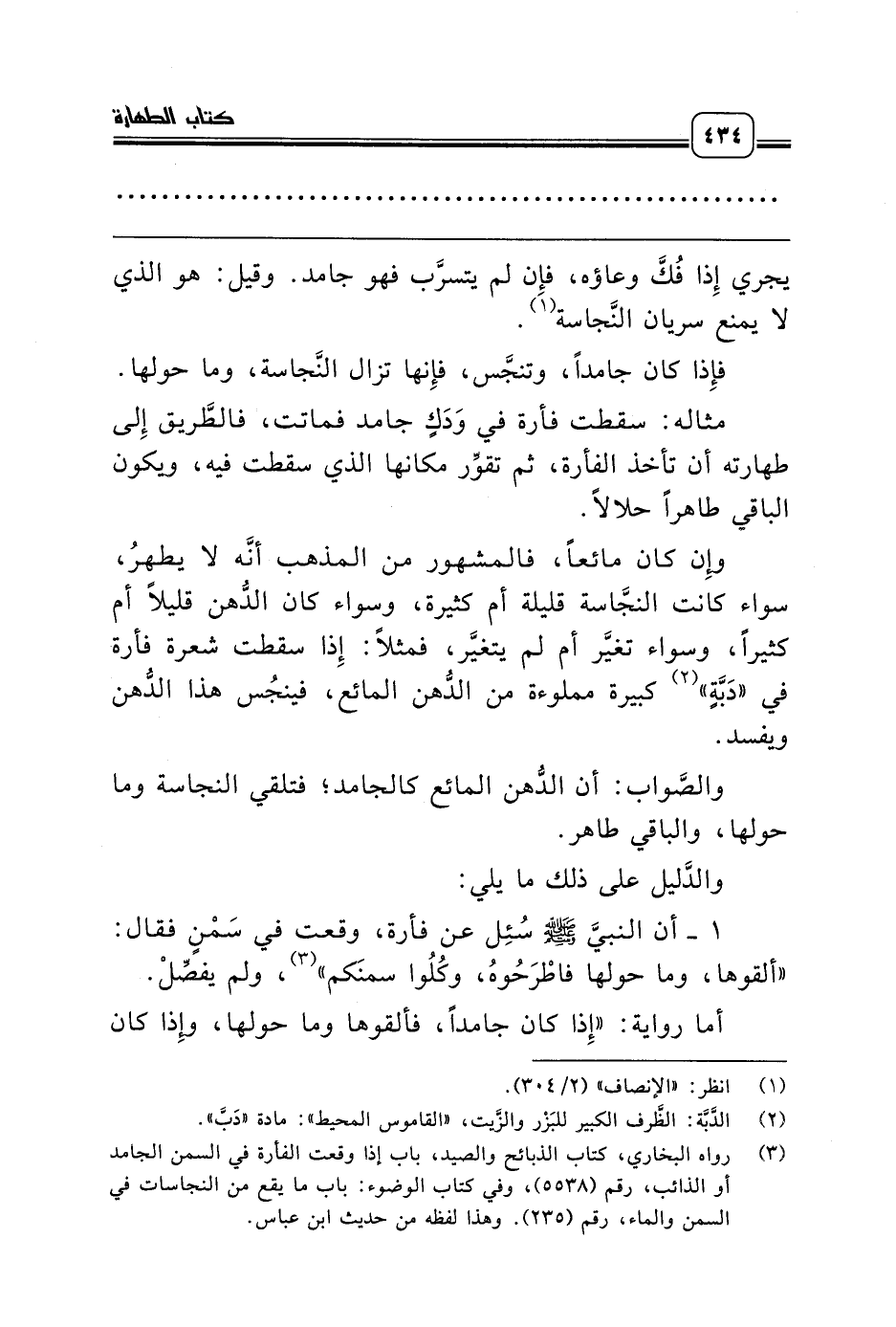 (¬3) رواه البخاري، كتاب الذبائح والصيد، باب إذا وقعت الفأرة في السمن الجامد أو الذائب، رقم (5538)، وفي كتاب الوضوء: باب ما يقع من النجاسات في السمن والماء، رقم (235). وهذا لفظه من حديث ابن عباس.