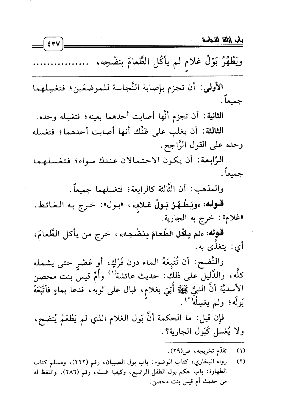 (¬2) رواه البخاري، كتاب الوضوء: باب بول الصبيان، رقم (222)، ومسلم كتاب الطهارة: باب حكم بول الطفل الرضيع، وكيفية غسله، رقم (286)، واللفظ له من حديث أم قيس بنت محصن .....