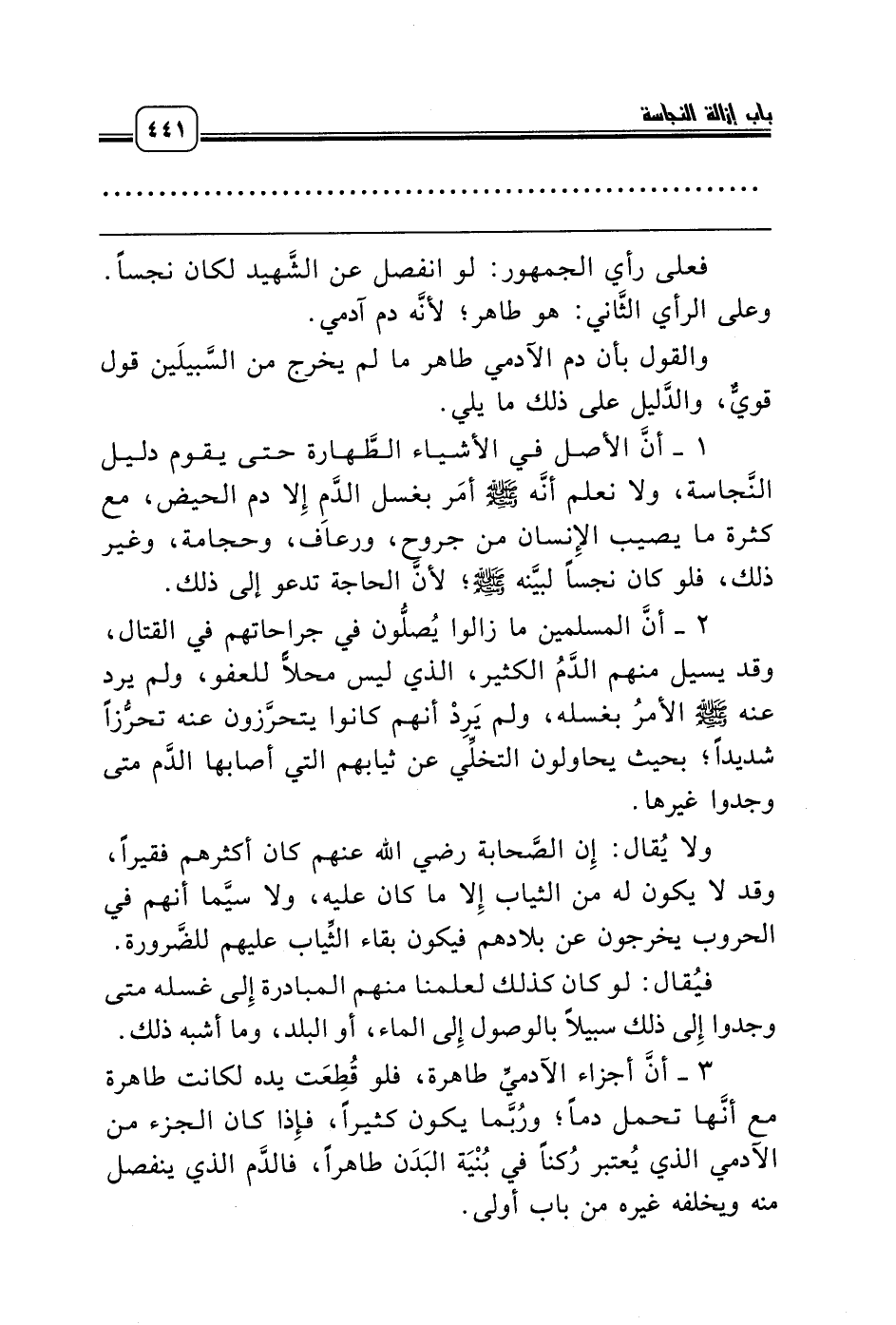 2 - أنَّ المسلمين ما زالوا يُصلُّون في جراحاتهم في القتال، وقد يسيل منهم الدَّمُ الكثير، الذي ليس محلاًّ للعفو، ولم يرد عنه صلّى الله عليه وسلّم الأمرُ بغسله، ولم يَرِدْ أنهم كانوا يتحرَّزون عنه تحرُّزاً شديداً؛ بحيث يحاولون التخلِّي عن ثيابهم التي أصابها الدَّم متى وجدوا غيرها.