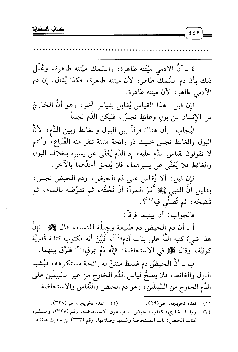ب- أنَّ الحيضَ دم غليظ منتنٌ له رائحة مستكرهة، فيُشبه البول والغائط، فلا يصحُّ قياس الدَّم الخارج من غير السَبيلَين على الدَّم الخارج من السَّبيلَين، وهو دم الحيض والنِّفاس والاستحاضة.