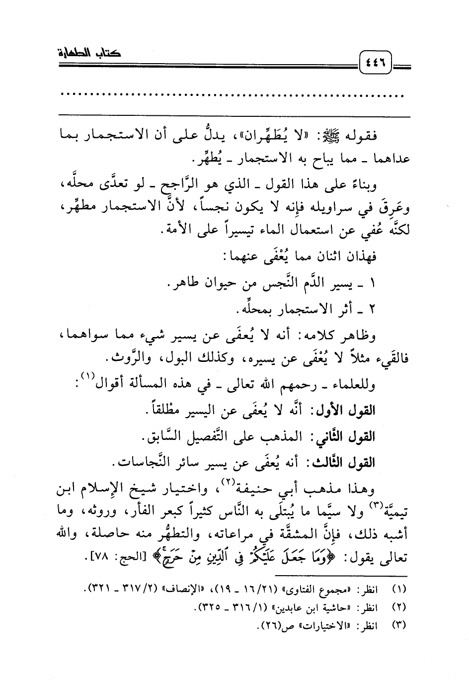 وهذا مذهب أبي حنيفة (¬2)، واختيار شيخ الإِسلام ابن تيميَّة (¬3) ولا سيَّما ما يُبتلَى به النَّاس كثيراً كبعر الفأر، وروثه، وما أشبه ذلك، فإِنَّ المشقَّة في مراعاته، والتطهُّر منه حاصلة، والله تعالى يقول: {وَمَا جَعَلَ عَلَيْكُمْ فِي الدِّينِ مِنْ حَرَجٍ} [الحج: 78].