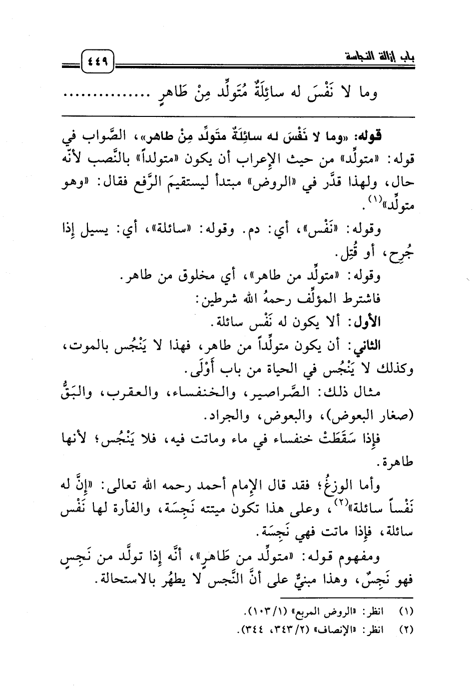 قوله: «وما لا نَفْسَ له سائِلَةٌ متَولِّد مِنْ طاهر»، الصَّواب في قوله: «متولِّد» من حيث الإِعراب أن يكون «متولداً» بالنَّصب لأنّه حال، ولهذا قدَّر في «الروض» مبتدأ ليستقيمَ الرَّفع فقال: «وهو متولِّد» (¬1).