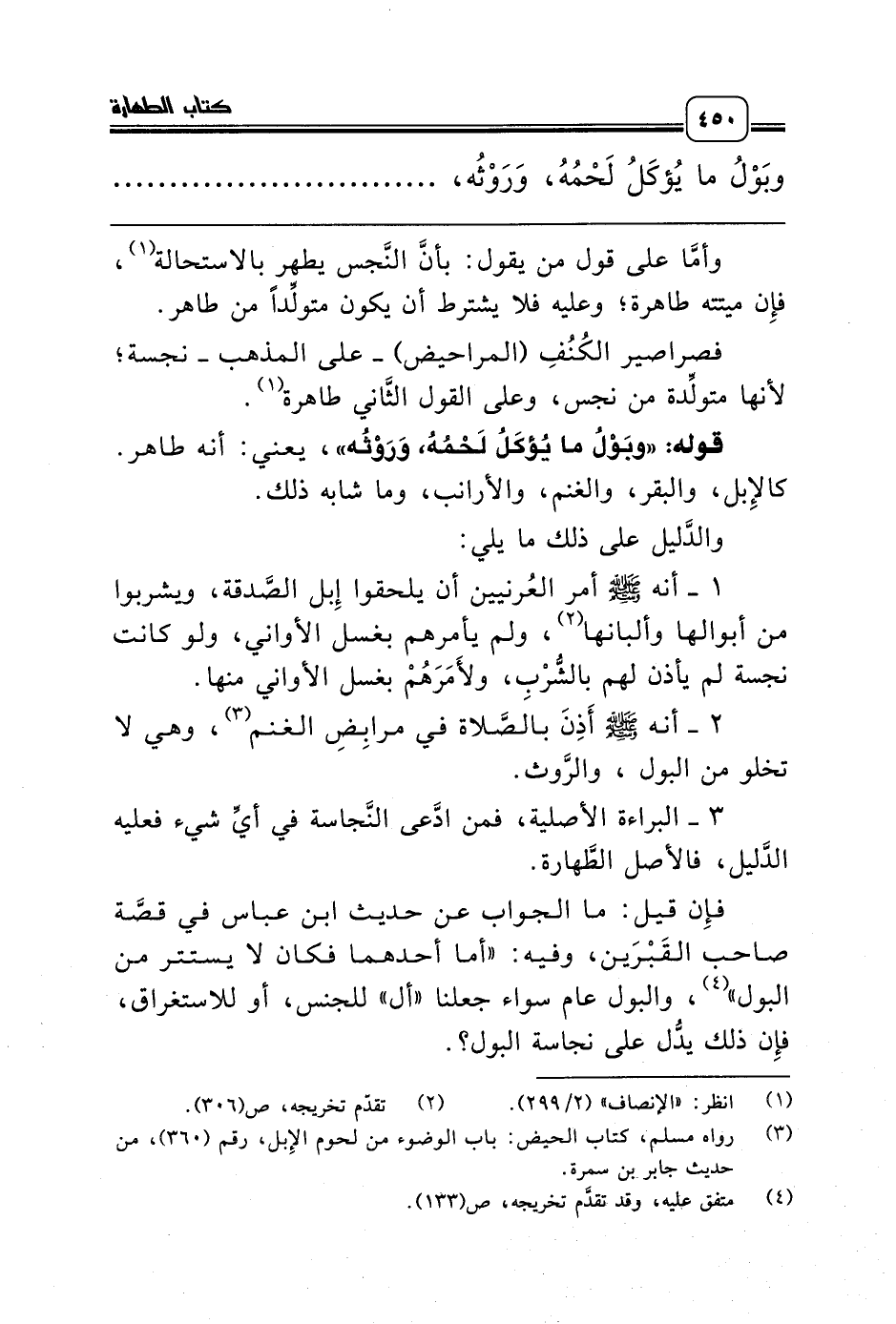 قوله: «وبَوْلُ ما يُؤكَلُ لَحْمُهُ، وَرَوْثُه»، يعني: أنه طاهر. كالإِبل، والبقر، والغنم، والأرانب، وما شابه ذلك.
