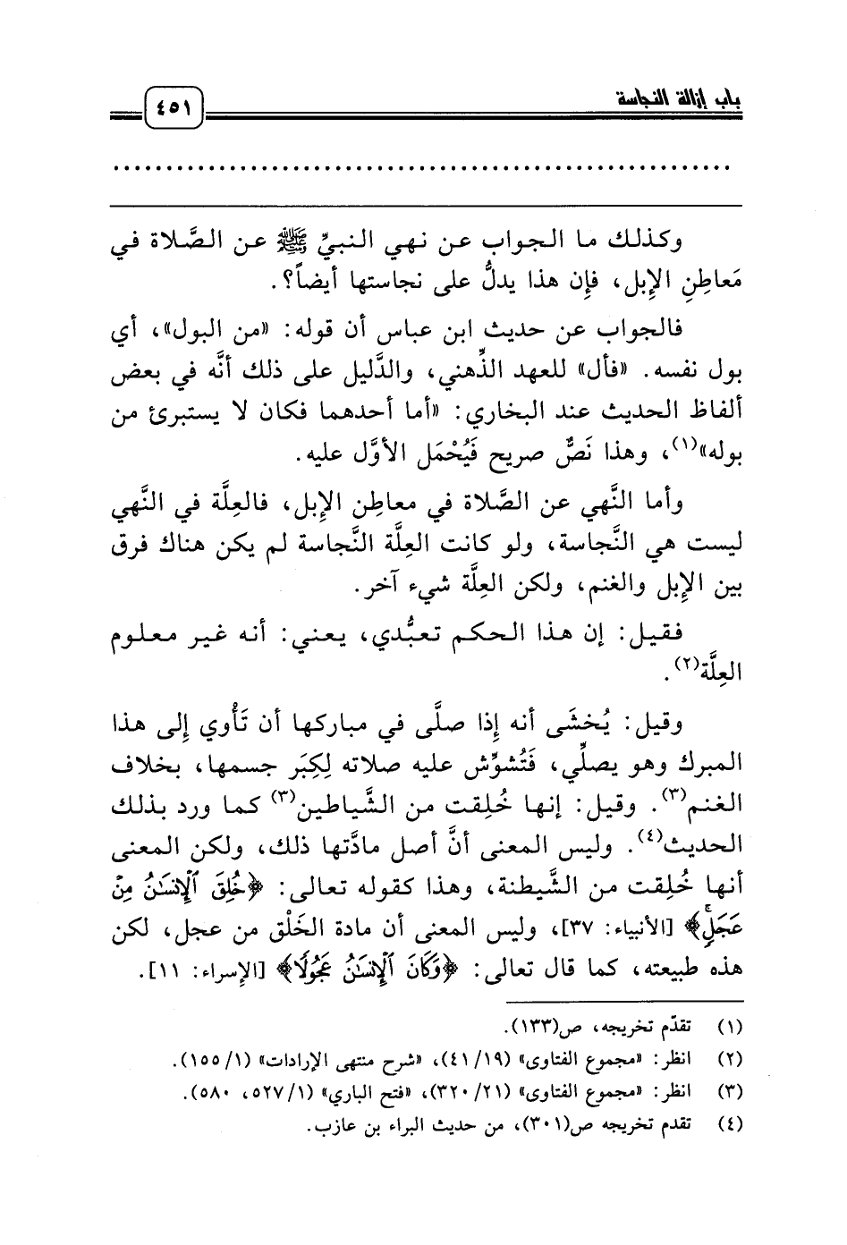 وأما النَّهي عن الصَّلاة في معاطِن الإِبل، فالعِلَّة في النَّهي ليست هي النَّجاسة، ولو كانت العِلَّة النَّجاسة لم يكن هناك فرق بين الإِبل والغنم، ولكن العِلَّة شيء آخر.