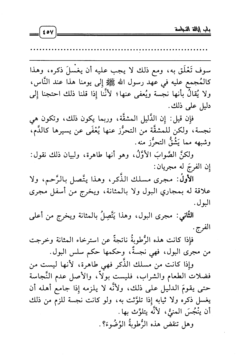 سوف تَعْلَق به، ومع ذلك لا يجب عليه أن يغسلَ ذكره، وهذا كالمُجمع عليه في عهد رسول الله صلّى الله عليه وسلّم إِلى يومنا هذا عند النَّاس، ولا يُقالُ بأنها نجسة ويُعفى عنها؛ لأنَّنا إِذا قلنا ذلك احتجنا إِلى دليل على ذلك.