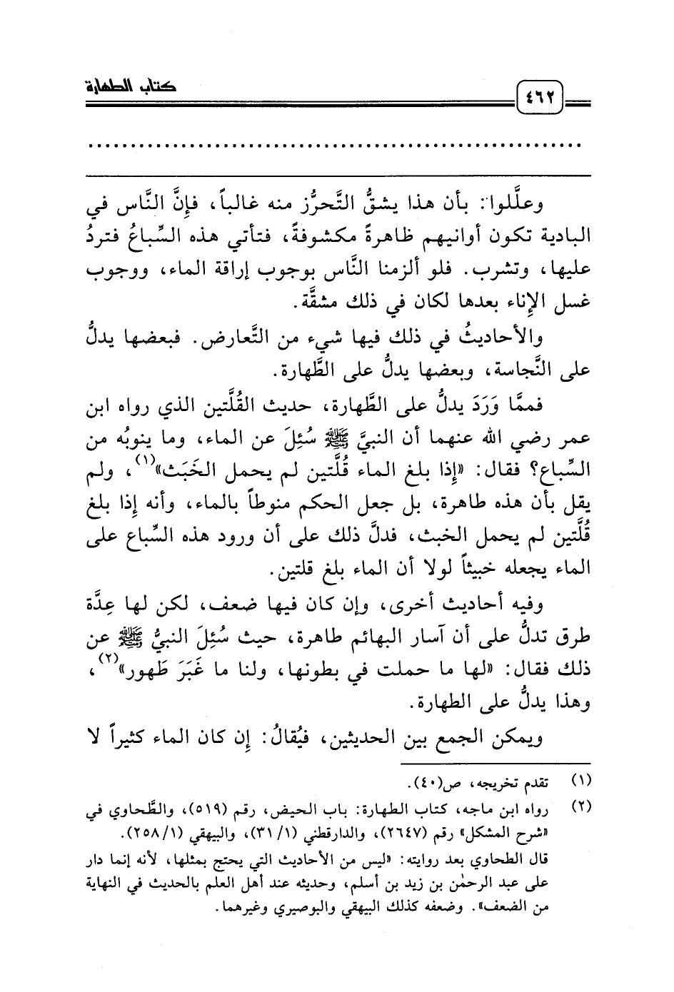 فممَّا وَرَدَ يدلُّ على الطَّهارة، حديث القُلَّتين الذي رواه ابن عمر رضي الله عنهما أن النبيَّ صلّى الله عليه وسلّم سُئِلَ عن الماء، وما ينوبُه من السِّباع؟ فقال: «إِذا بلغ الماء قُلَّتين لم يحمل الخَبَث» (¬1)، ولم يقل بأن هذه طاهرة، بل جعل الحكم منوطاً بالماء، وأنه إِذا بلغ قُلَّتين لم يحمل الخبث، فدلَّ ذلك على أن ورود هذه السِّباع على الماء يجعله خبيثاً لولا أن الماء بلغ قلتين.