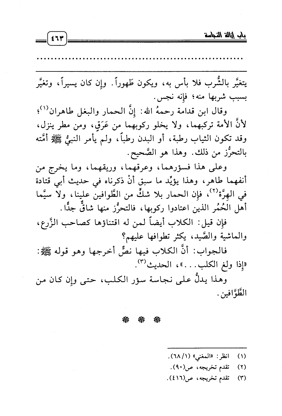 وعلى هذا فسؤرهما، وعرقهما، وريقهما، وما يخرج من أنفهما طاهر، وهذا يؤيِّد ما سبق أنْ ذكرناه في حديث أبي قتادة في الهِرَّة (¬2)، فإِن الحمار بلا شكٍّ من الطَّوافين علينا، ولا سيَّما أهل الحُمُر الذين اعتادوا ركوبها، فالتحرُّز منها شاقٌّ جدًّا.