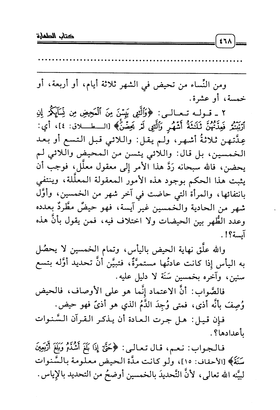2 - قوله تعالى: {وَاللاََّّئِي يَئِسْنَ مِنَ الْمَحِيضِ مِنْ نِسَائِكُمْ إِنِ ارْتَبْتُمْ فَعِدَّتُهُنَّ ثَلاَثَةُ أَشْهُرٍ وَاللاََّّئِي لَمْ يَحِضْنَ} [الطلاق: 4]، أي: عِدَّتهن ثلاثةُ أشهر، ولم يقل: واللائي قبل التسع أو بعد الخمسين، بل قال: واللائي يئسن من المحيض واللائي لم يحضن، فالله سبحانه رَدَّ هذا الأمر إِلى معقول معلَّل، فوجب أن يثبت هذا الحكم بوجود هذه الأمور المعقولة المعلَّلة، وينتفي بانتفائها، والمرأة التي حاضت في آخر شهر من الخمسين، وأوَّل شهر من الحادية والخمسين غير آيسة، فهو حيضٌ مطَّردٌ بعدده وعدد الطُّهر بين الحيضات ولا اختلاف فيه، فمن يقول بأنَّ هذه آيسة؟!.