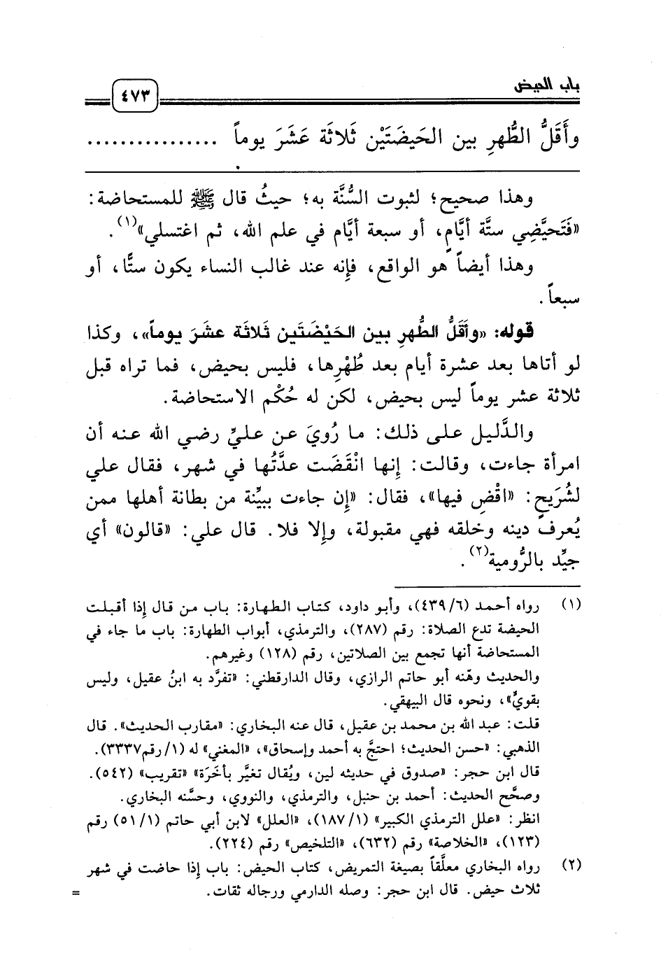 (¬2) رواه البخاري معلَّقاً بصيغة التمريض، كتاب الحيض: باب إِذا حاضت في شهر ثلاث حيض. قال ابن حجر: وصله الدارمي ورجاله ثقات.