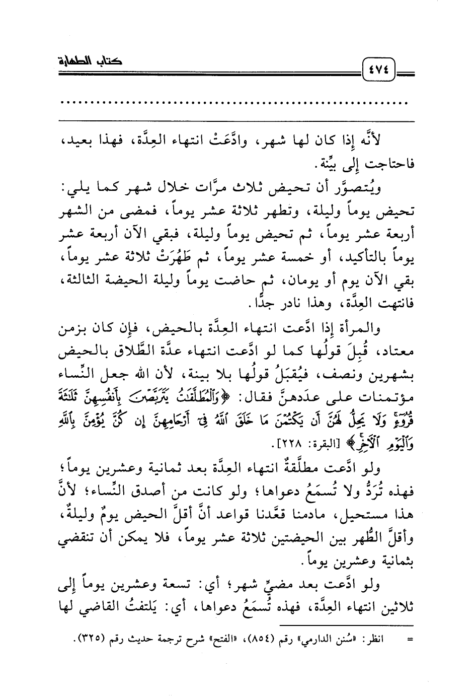 ولو ادَّعت مطلَّقةٌ انتهاء العِدَّة بعد ثمانية وعشرين يوماً؛ فهذه تُرَدُّ ولا تُسمَعُ دعواها؛ ولو كانت من أصدق النِّساء؛ لأنَّ هذا مستحيل، مادمنا قعَّدنا قواعد أنَّ أقلَّ الحيض يومٌ وليلةٌ، وأقلَّ الطُّهر بين الحيضتين ثلاثة عشر يوماً، فلا يمكن أن تنقضي بثمانية وعشرين يوماً.