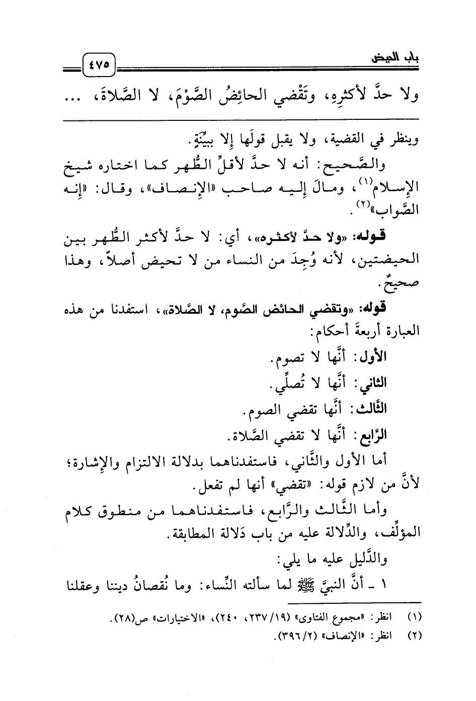 قوله: «وتقضي الحائض الصَّوم، لا الصَّلاة»، استفدنا من هذه العبارة أربعةَ أحكام: