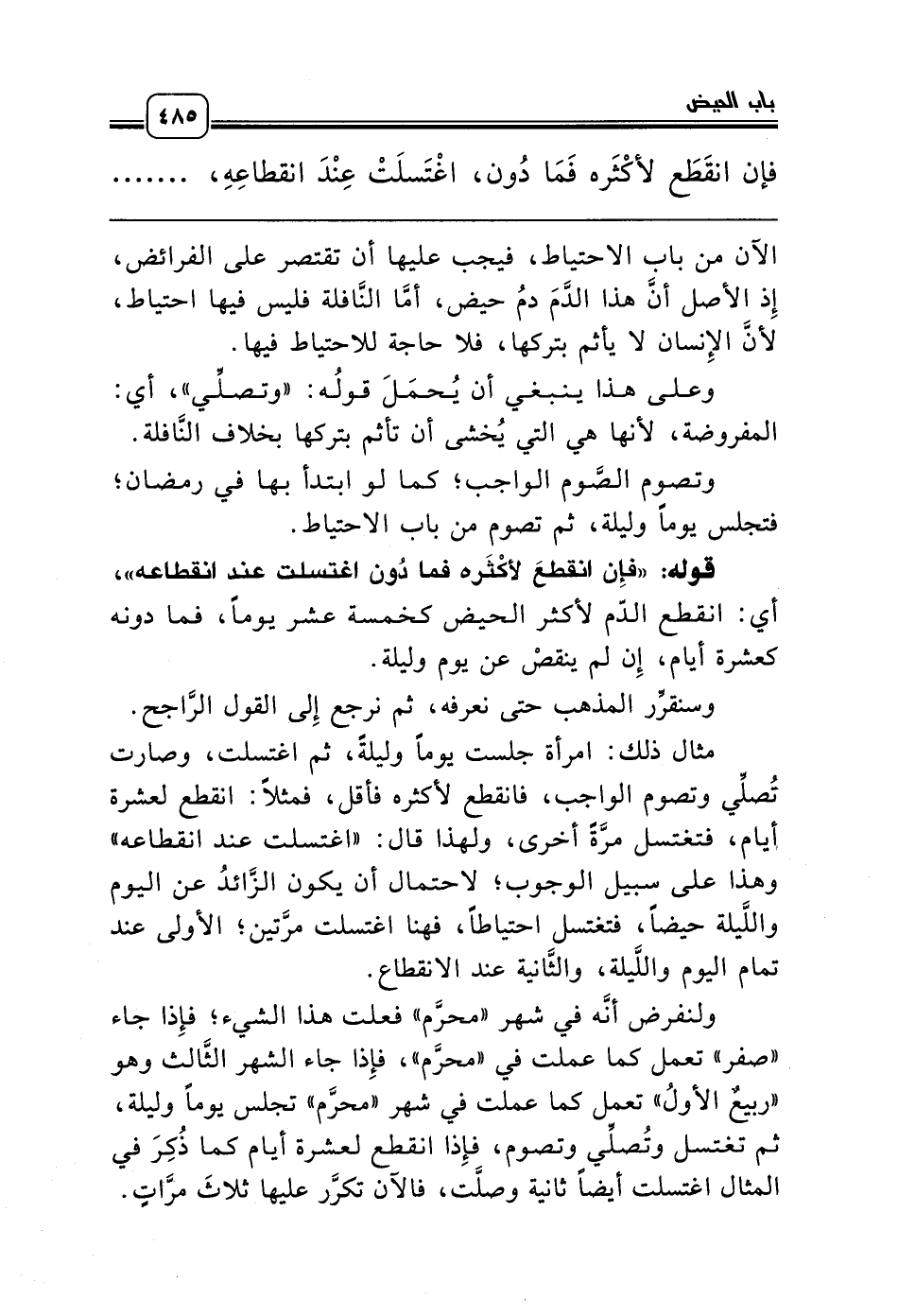 قوله: «فإِن انقطعَ لأكْثَره فما دُون اغتسلت عند انقطاعه»، أي: انقطع الدّم لأكثر الحيض كخمسة عشر يوماً، فما دونه كعشرة أيام، إِن لم ينقصْ عن يوم وليلة.