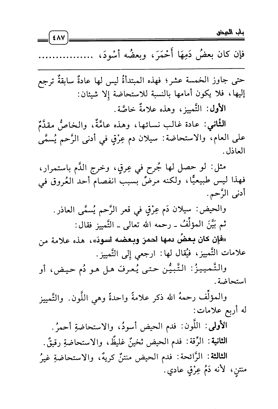 «فإِن كان بعضُ دمها أحمرَ وبعضه أسودَ»، هذه علامة من علامات التَّمييز، فيُقال لها: ارجعي إِلى التَّمييز.
