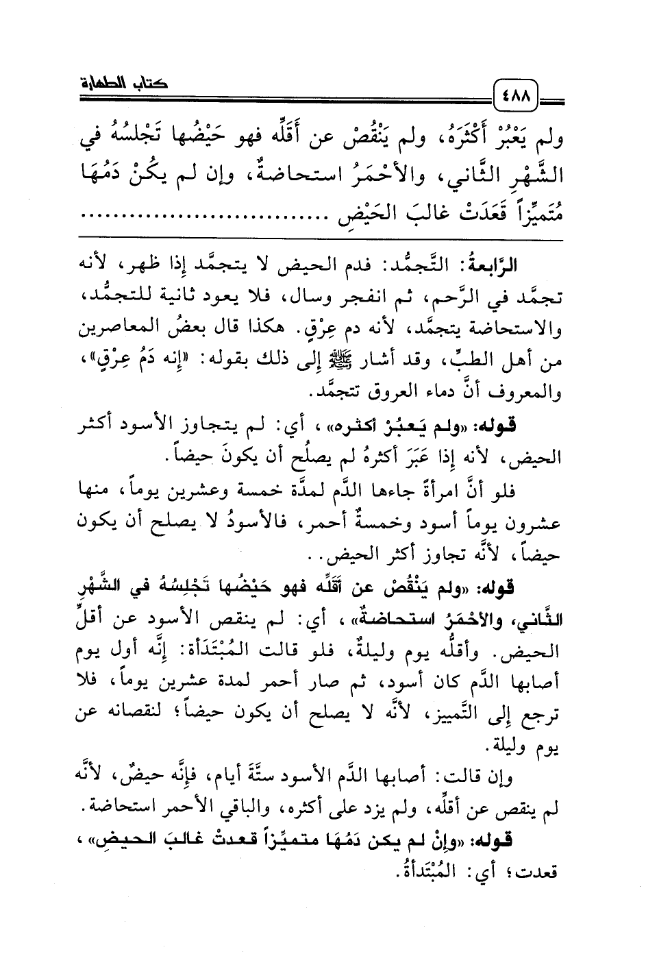 قوله: «ولم يَنْقُصْ عن أَقَلِّه فهو حَيْضُها تَجْلِسُهُ في الشَّهْرِ الثَّاني، والأحْمَرُ استحاضةٌ»، أي: لم ينقص الأسود عن أقلِّ الحيض. وأقلُّه يوم وليلةٌ، فلو قالت المُبْتَدَأة: إِنَّه أول يوم أصابها الدَّم كان أسود، ثم صار أحمر لمدة عشرين يوماً، فلا ترجع إِلى التَّمييز، لأنَّه لا يصلح أن يكون حيضاً؛ لنقصانه عن يوم وليلة.