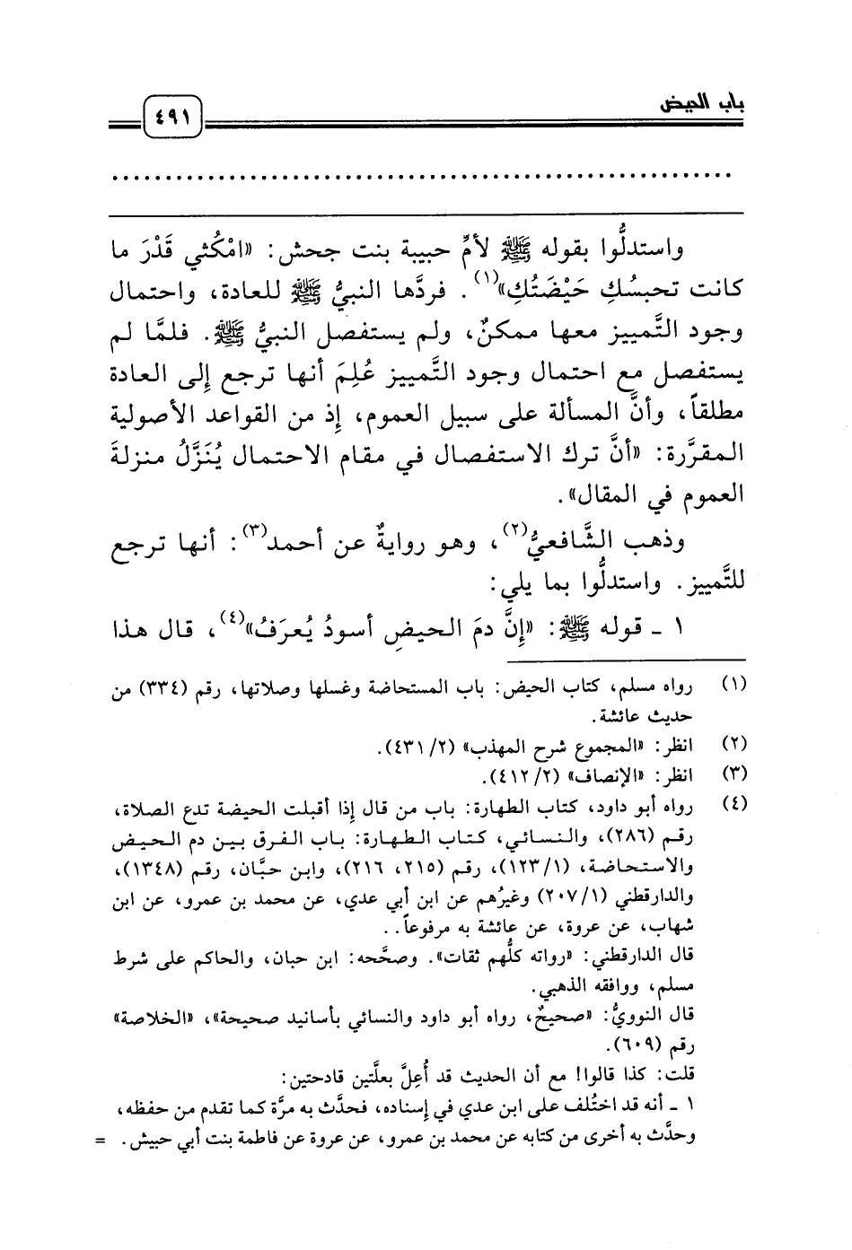 واستدلُّوا بقوله صلّى الله عليه وسلّم لأمِّ حبيبة بنت جحش: «امْكُثي قَدْرَ ما كانت تحبسُكِ حَيْضَتُكِ» (¬1). فردَّها النبيُّ صلّى الله عليه وسلّم للعادة، واحتمال وجود التَّمييز معها ممكنٌ، ولم يستفصل النبيُّ صلّى الله عليه وسلّم. فلمَّا لم يستفصل مع احتمال وجود التَّمييز عُلِمَ أنها ترجع إِلى العادة مطلقاً، وأنَّ المسألة على سبيل العموم، إِذ من القواعد الأصولية المقرَّرة: «أنَّ ترك الاستفصال في مقام الاحتمال يُنَزَّلُ منزلةَ العموم في المقال».