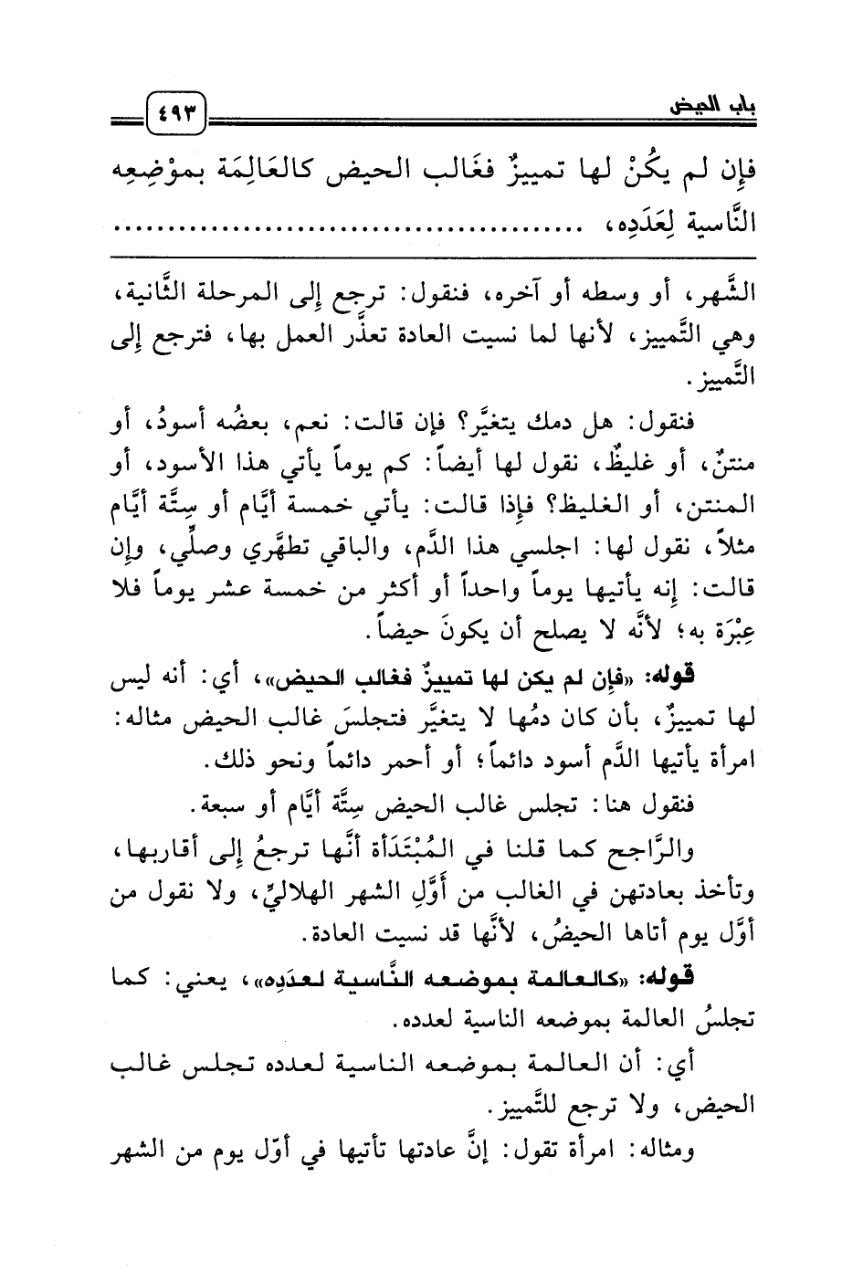 فنقول: هل دمك يتغيَّر؟ فإن قالت: نعم، بعضُه أسودُ، أو منتنٌ، أو غليظٌ، نقول لها أيضاً: كم يوماً يأتي هذا الأسود، أو المنتن، أو الغليظ؟ فإِذا قالت: يأتي خمسة أيَّام أو سِتَّة أيَّام مثلاً، نقول لها: اجلسي هذا الدَّم، والباقي تطهَّري وصلِّي، وإِن قالت: إِنه يأتيها يوماً واحداً أو أكثر من خمسة عشر يوماً فلا عِبْرَة به؛ لأنَّه لا يصلح أن يكونَ حيضاً.