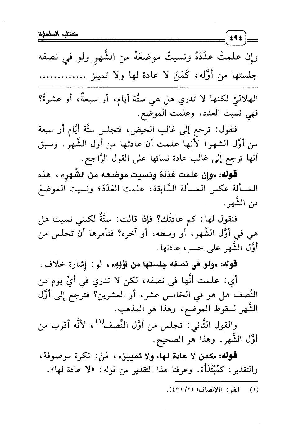 الهلاليِّ لكنها لا تدري هل هي ستَّة أيام، أو سبعةٌ، أو عشرةٌ؟ فهي نسيت العدد، وعلمت الموضع.