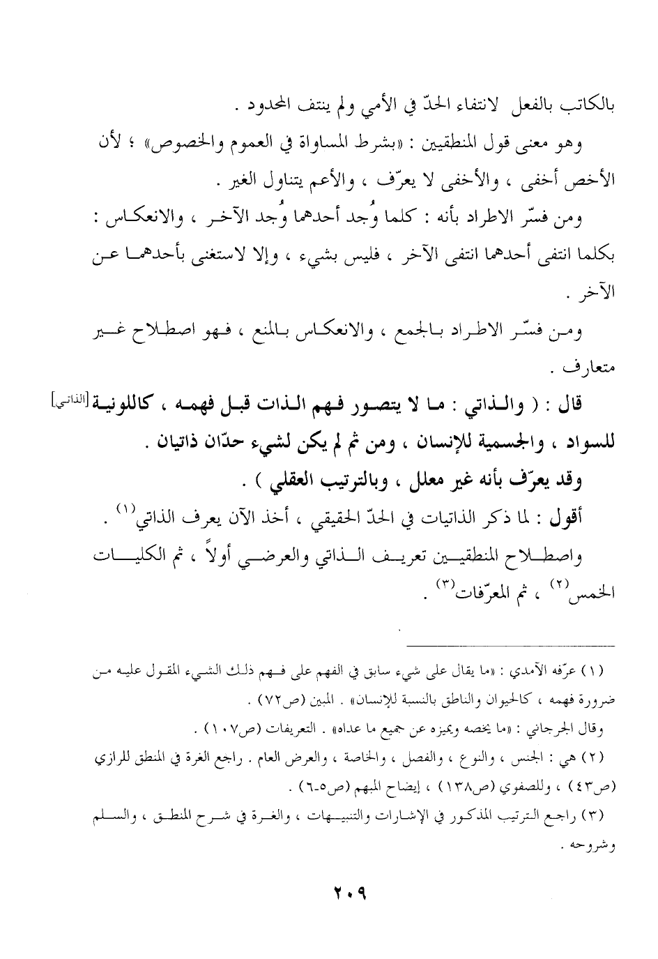 أقول: لما ذكر الذاتيات في الحد الحقيقي, أخذ الآن يعرف الذاتي. واصطلاح المنطقيين تعريف الذاتي والعرضي أولًا, ثم الكليات الخمس, ثم المعرفات.