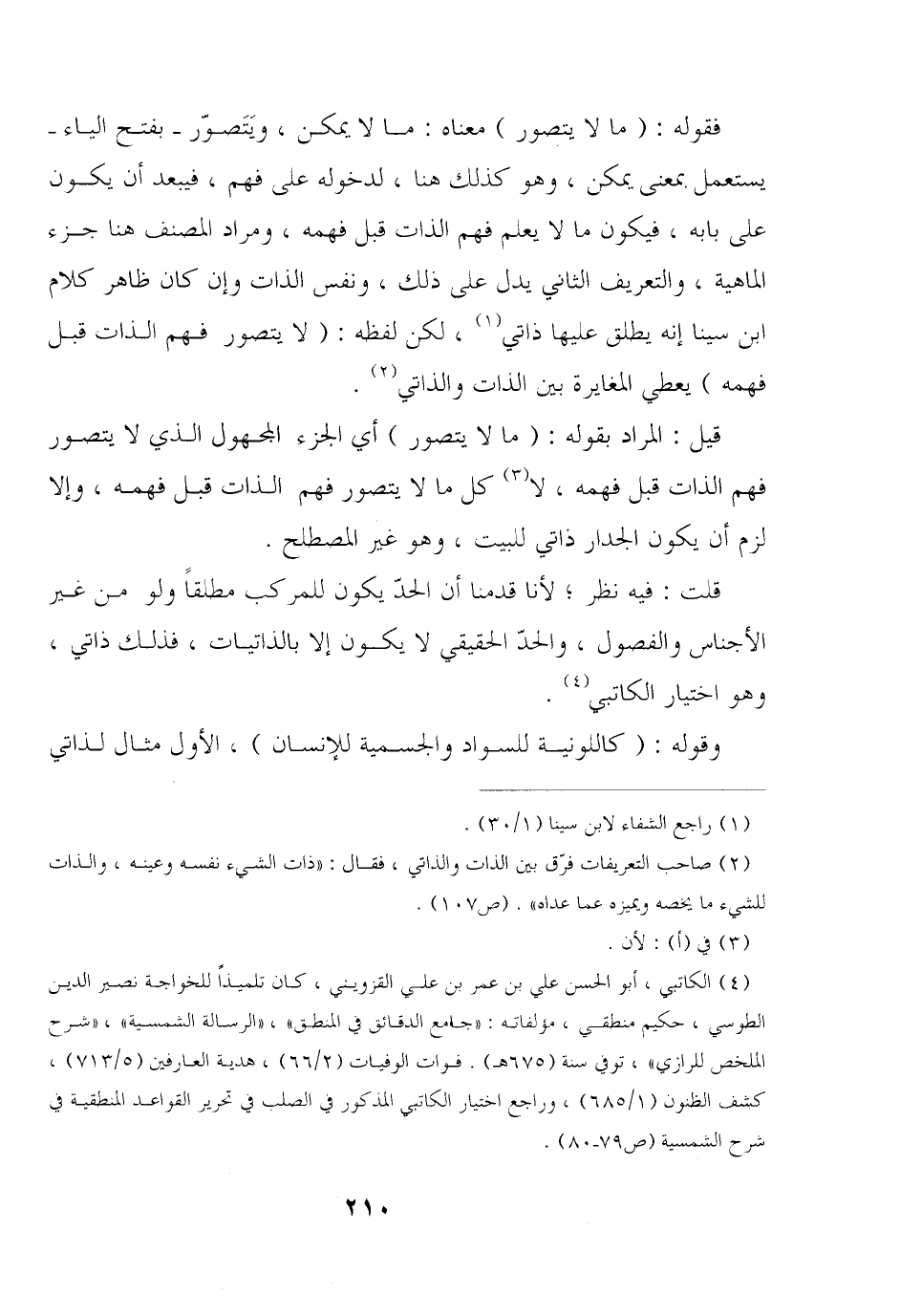 فقوله: (ما لا يتصور) معناه: ما لا يمكن, ويتصور - بفتح الياء - يستعمل بمعنى يمكن, وهو كذلك هنا, لدخوله على فهم, فيبعد أن يكون على بابه, فيكون ما لا يعلم فهم الذات قبل فهمه, ومراد المصنف هنا جزء الماهية, والتعريف الثاني يدل على ذلك, ونفس الذات وإن كان ظاهر كلام ابن سينا إنه يطلق عليها ذاتي, لكن لفظه: (لا يتصور فهم الذات قبل فهمه) يعطي المغايرة بين الذات والذاتي.