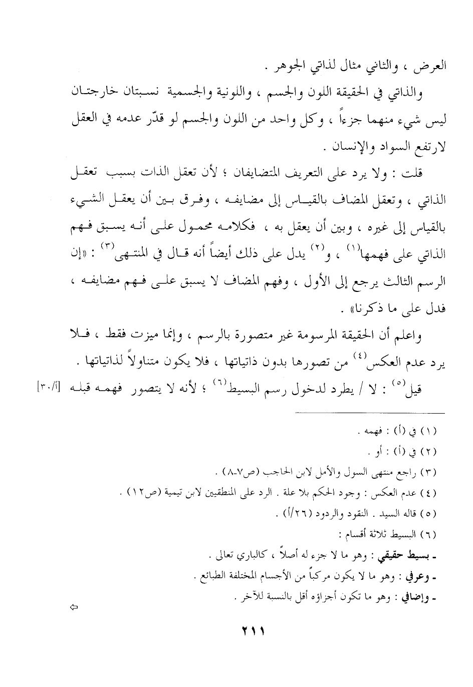 قلت: ولا يرد على التعريف المتضايفان؛ لأن تعقل الذات بسبب تعقل الذاتي, وتعقل المضاف بالقياس إلى مضايفه, وفرق بين أن يعقل الشيء بالقياس إلى غيره, وبين أن يعقل به, فكلامه محمول على أنه يسبق فهم الذاتي على فهمها, ويدل على ذلك أيضًا أنه قال في المنتهى: «إن الرسم الثالث يرجع إلى الأول, وفهم المضاف لا يسبق على فهم مضايفه, فدل على ما ذكرنا».