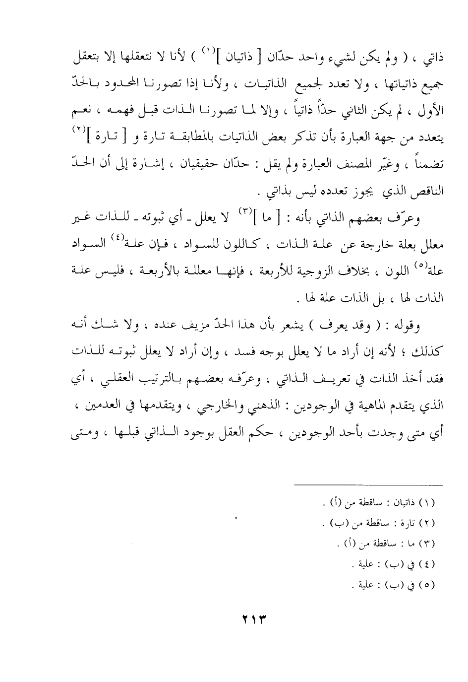 ذاتي, (ولم يكن لشيء واحد حدان [ذاتيان]) لأنا لا نتعقلها إلا بتعقل جميع ذاتياتها, ولا تعدد لجميع الذاتيات, ولأنا إذا تصورنا المحدود بالحد الأول, لم يكن الثاني حدًا ذاتيًا, وإلا لما تصورنا الذات قبل فهمه, نعم يتعدد من جهة العبارة بأن تذكر بعض الذاتيات بالمطابقة تارة و [تارة] تضمنًا, وغير المصنف العبارة ولم يقل: حدان حقيقيان, إشارة إلى أن الحد الناقص الذي يجوز تعدد ليس بذاتي.