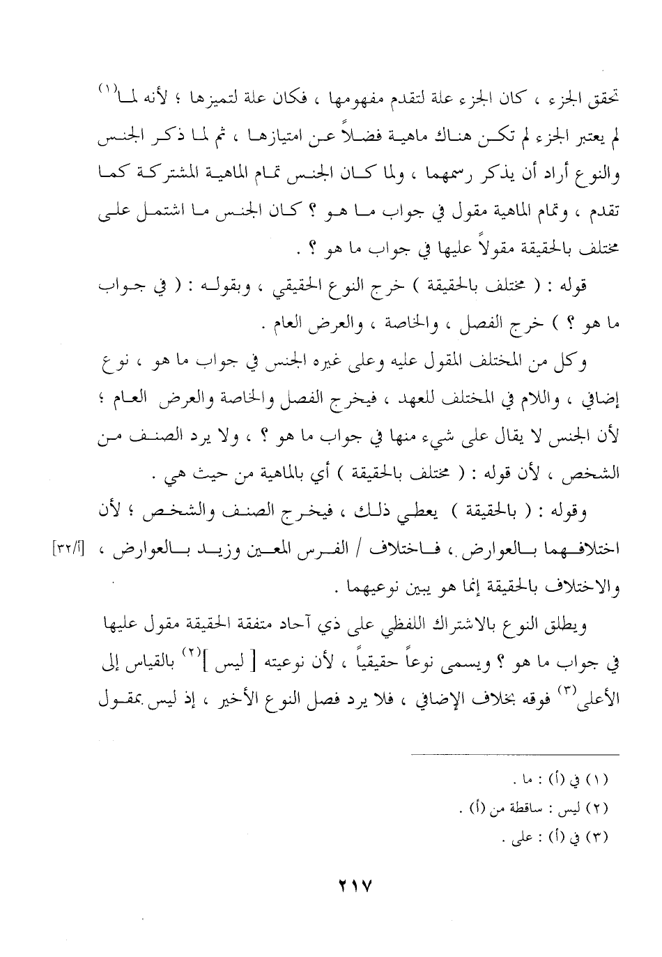 تحقق الجزء, كان الجزء علة لتقدم مفهومها, فكان على لتميزها؛ لأنه لما لم يعتبر الجزء لم تكن هناك ماهية فضلًا عن امتيازها, ثم لما ذكر الجنس والنوع أراد أن يذكر رسمهما, ولما كان الجنس تمام الماهية المشتركة كما تقدم, وتمام الماهية مقول في جواب ما هو؟ كان الجنس ما اشتمل على مختلف بالحقيقة مقولًا عليها في جواب ما هو؟ .