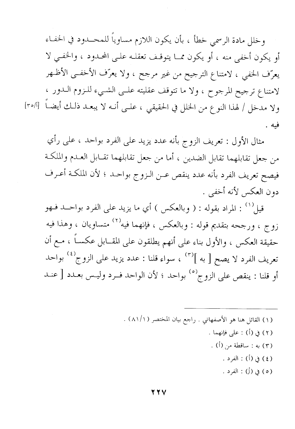 قيل: المراد بقوله: (وبالعكس) أي ما يزيد على الفرد بواحد فهو زوج, ورجحه بتقديم قوله: وبالعكس, فإنهما فيه متساويان, وهذا فيه حقيقة العكس, والأول بناء على أنهم يطلقون على المقابل عكسًا, مع أن تعريف الفرد لا يصح [به] , سواء قلنا: عدد يزيد على الزوج بواحد أو قلنا: ينقص على الزوج بواحد؛ لأن الواحد فرد وليس بعدد [عند