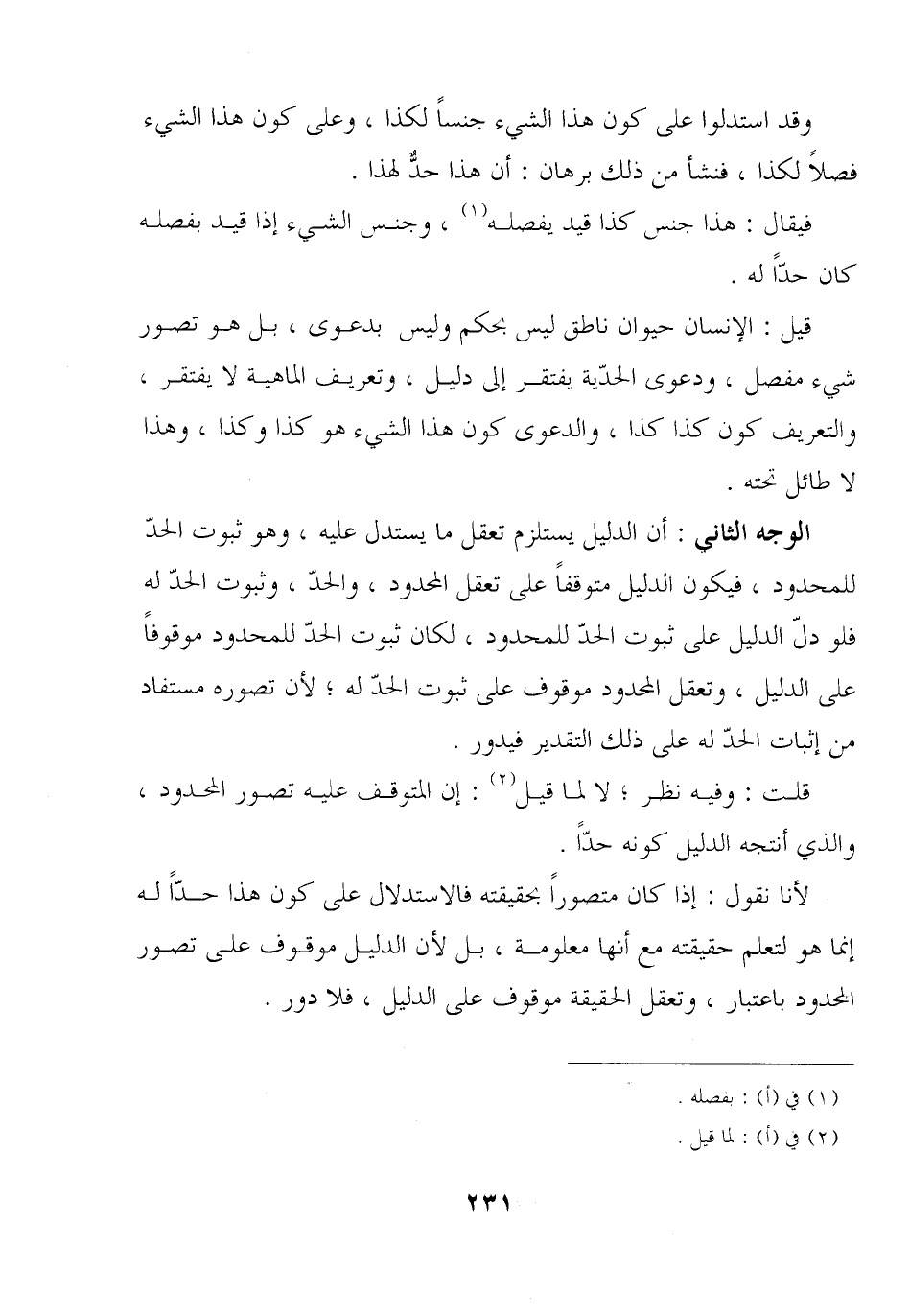 الوجه الثاني: أن الدليل يستلزم تعقل ما يستدل عليه, وهو ثبوت الحد للمحدود, فيكون الدليل متوقفًا على تعقل المحدود, والحد, وثبوت الحد له فلو دل الدليل على ثبوت الحد للمحدود, لكان ثبوت الحد للمحدود موقوفًا على الدليل, وتعقل المحدود موقوف على ثبوت الحد له؛ لأن تصوره مستفاد من إثبات الحد له على ذلك التقدير فيدور.