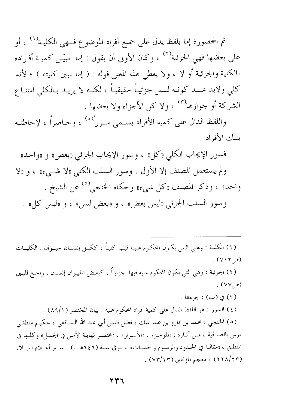 فسور الإيجاب الكلي «كل» , وسور الإيجاب الجزئي «بعض» و «واحد» ولم يستعمل المصنف إلا الأول. وسور السلب الكلي «لا شيء» , و «لا واحد» , وذكر المصنف «كل شيء» وحكاه الخنجي عن الشيخ.