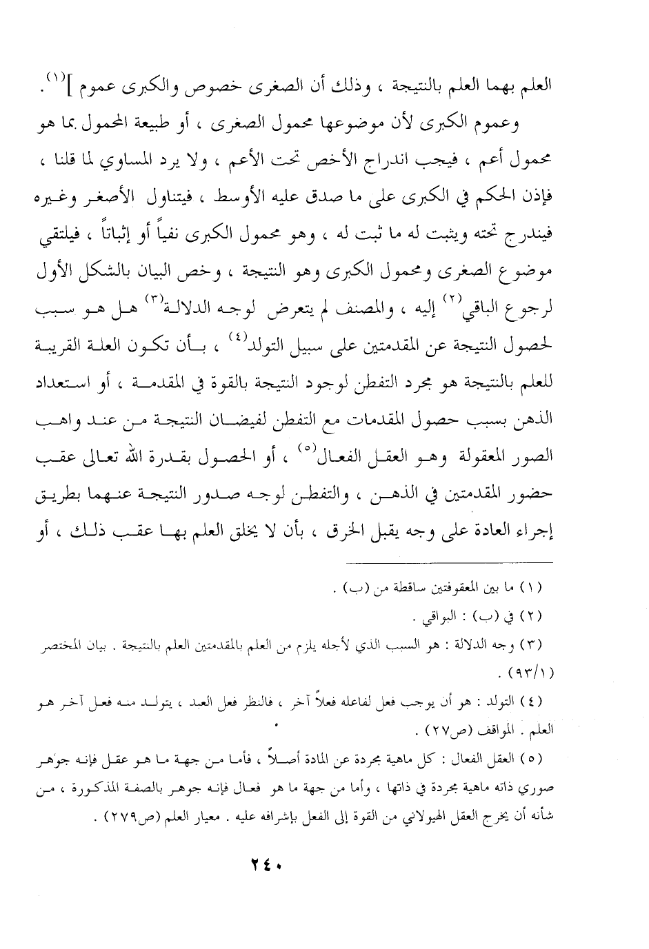 العلم بهما العلم بالنتيجة, وذلك أن الصغرى خصوص والكبرى عموم]. وعموم الكبرى لأن موضوعها محمول الصغرى, أو طبيعة المحمول بما هو محمول أعم, فيجب اندراج الأخص تحت الأعم, ولا يرد المساوي لما قلنا, فإذن الحكم في الكبرى على ما صدق عليه الأوسط, فيتناول الأصغر وغيره فيندرج تحته ويثبت له ما ثبت له, وهو محمول الكبرى نفيًا أو إثباتًا, فيلتقي موضوع الصغرى ومحمول الكبرى وهو النتيجة, وخص البيان بالشكل الأول لرجوع الباقي إليه, والمصنف لم يتعرض لوجه الدلالة هل هو سبب لحصول النتيجة عن المقدمتين على سبيل التولد, بأن تكون العلة القريبة للعلم بالنتيجة هو مجرد التفطن لوجود النتيجة بالقوة في المقدمة, أو استعداد الذهن بسبب حصول المقدمات مع التفطن لفيضان النتيجة من عند واهب الصور المعقولة وهو العقل الفعال, أو الحصول بقدرة الله تعالى عقب حضور المقدمتين في الذهن, والتفطن لوجه صدور النتيجة عنهما بطريق إجراء العادة على وجه يقبل الخرق, بأن لا يخلق العلم بها عقب ذلك, أو