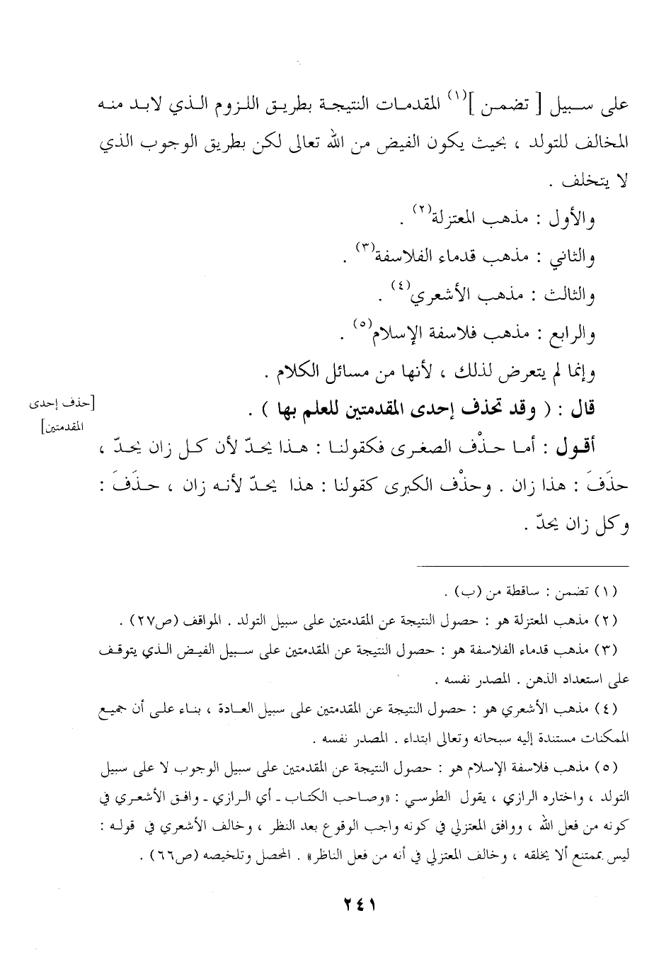 أقول: أما حذف الصغرى فكقولنا: هذا يحد لأن كل زان يحد, حذف: هذا زان. وحذف الكبرى كقولنا: هذا يحد لأنه زان, حذف: وكل زان يحد.