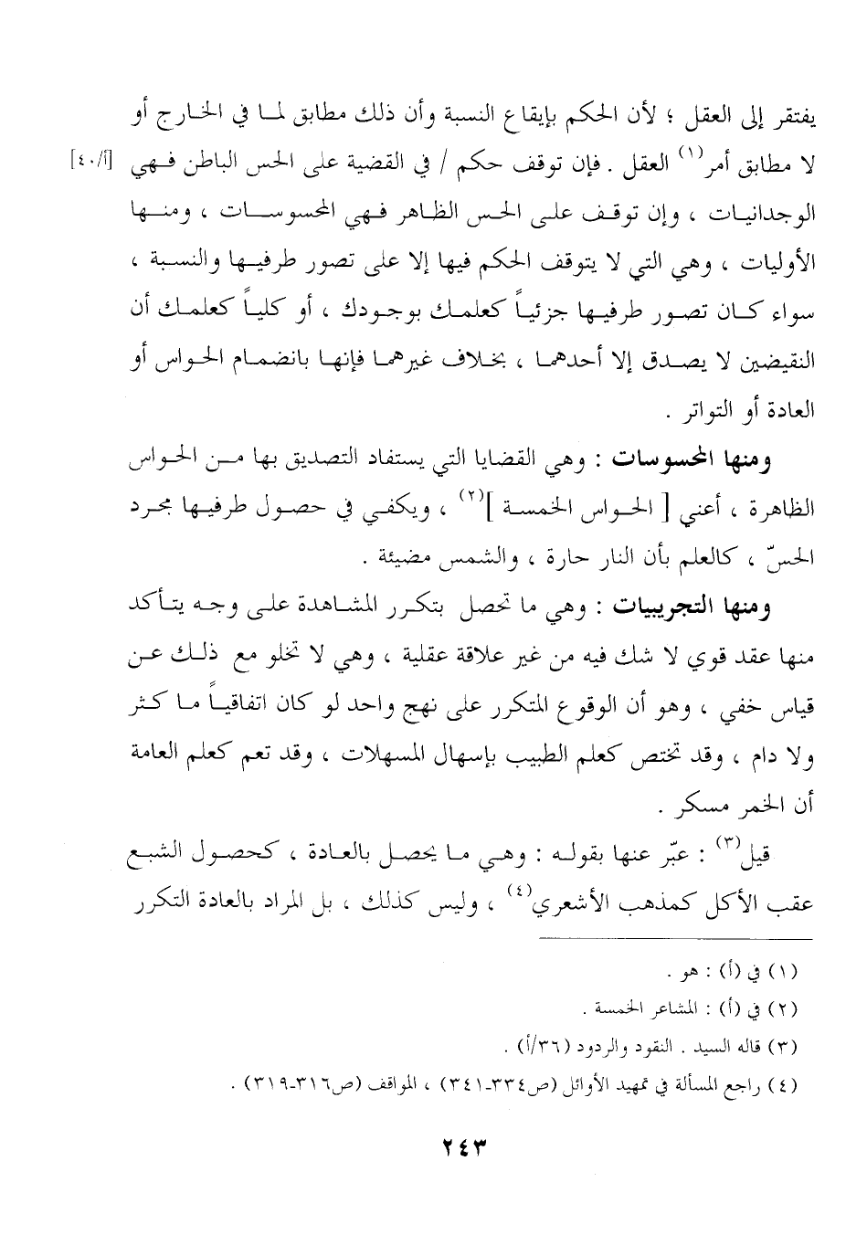 ومنها المحسوسات: وهي القضايا التي يستفاد التصديق بها من الحواس الظاهرة, أعني [الحواس الخمسة] , ويكفي في حصول طرفيها مجرد الحس, كالعلم بأن النار حارة, والشمس مضيئة.
